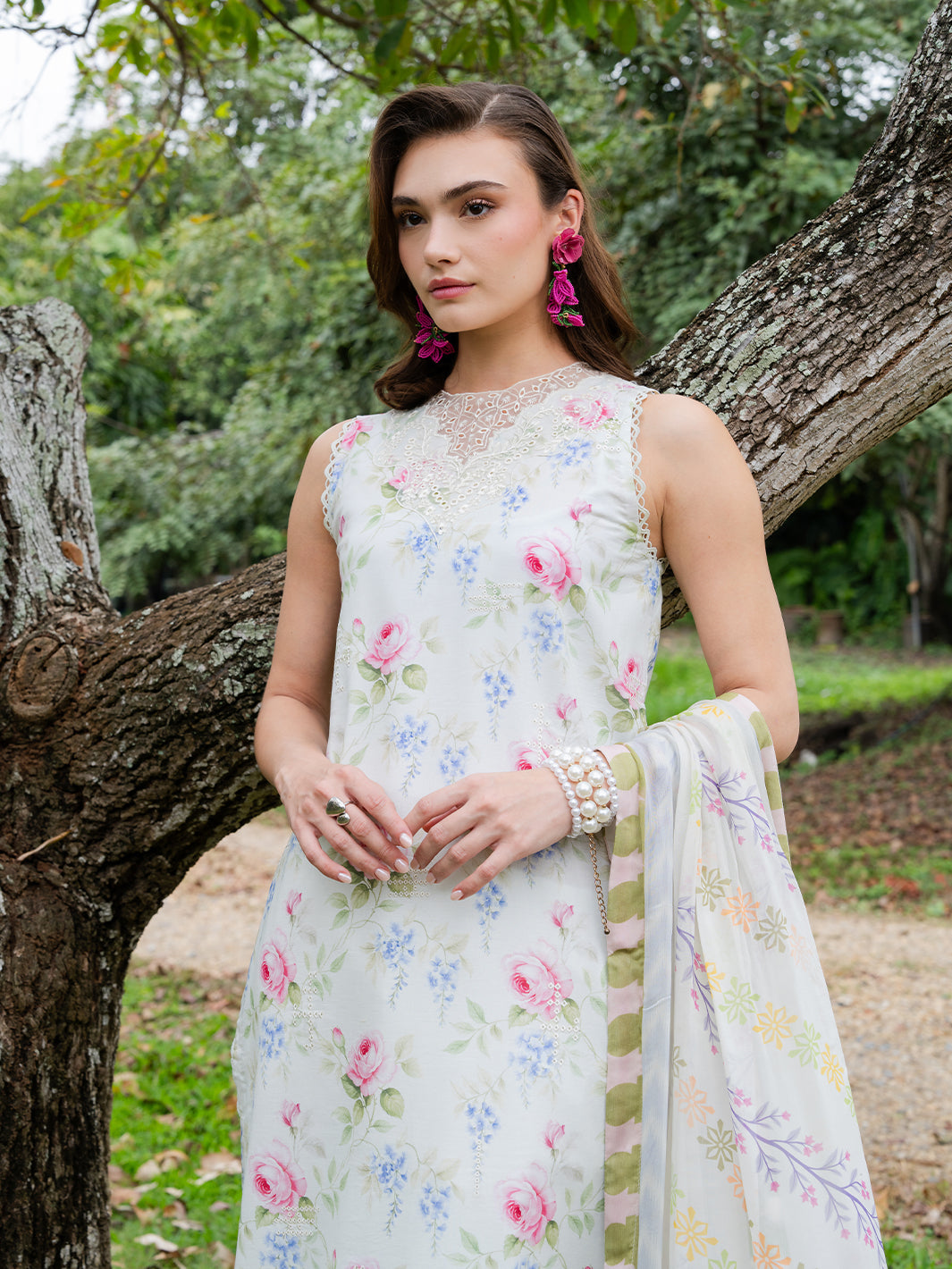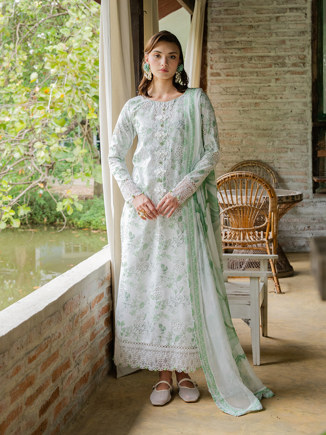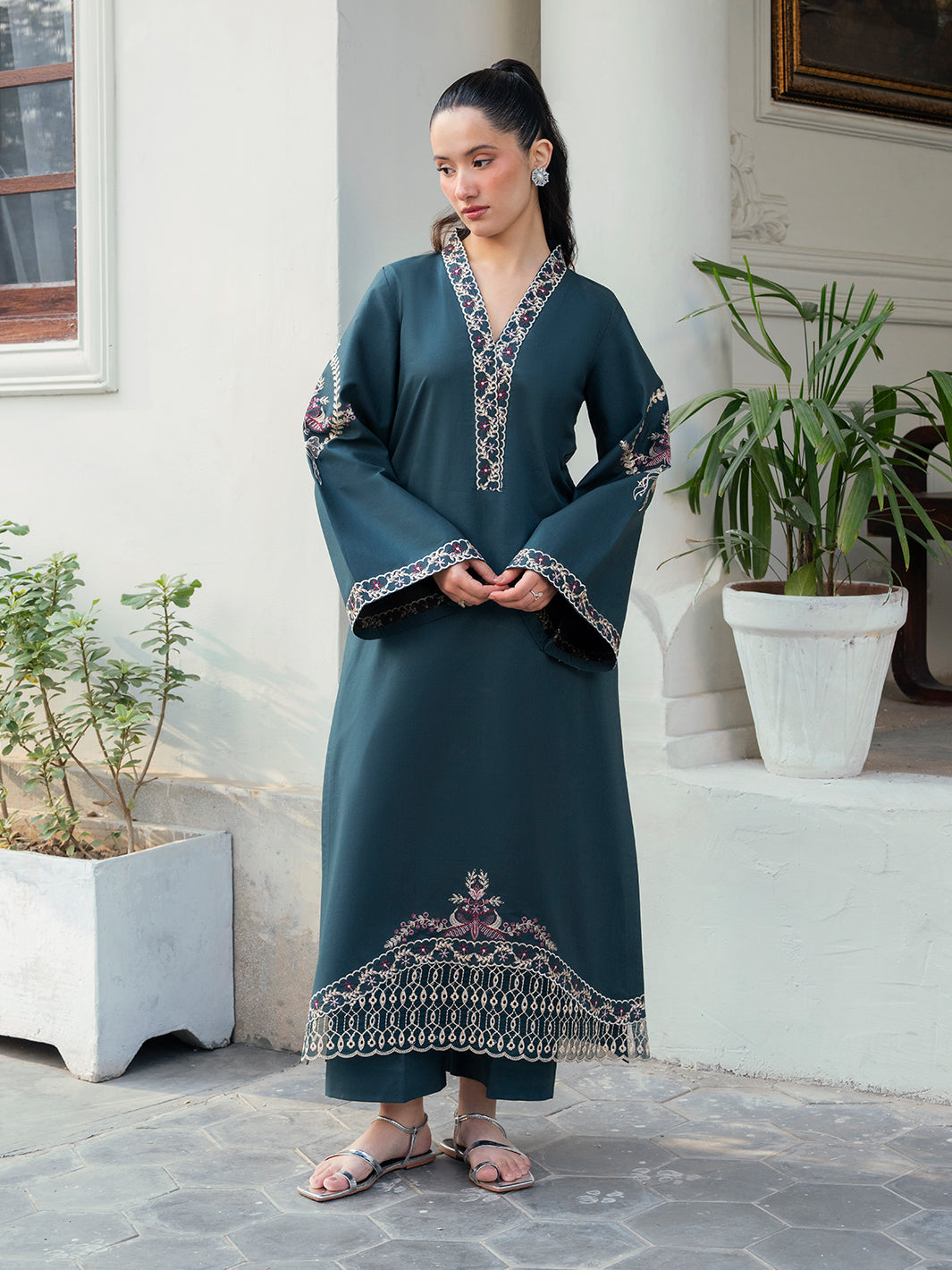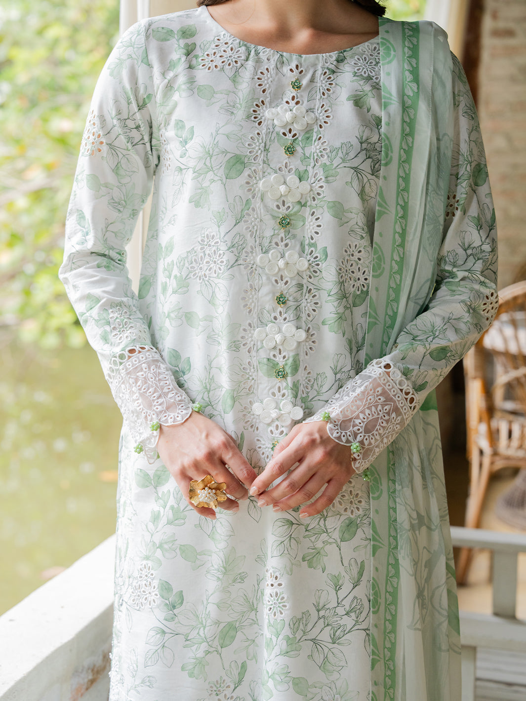 Green embroidered 2-piece suit with keyhole neckline and floral details