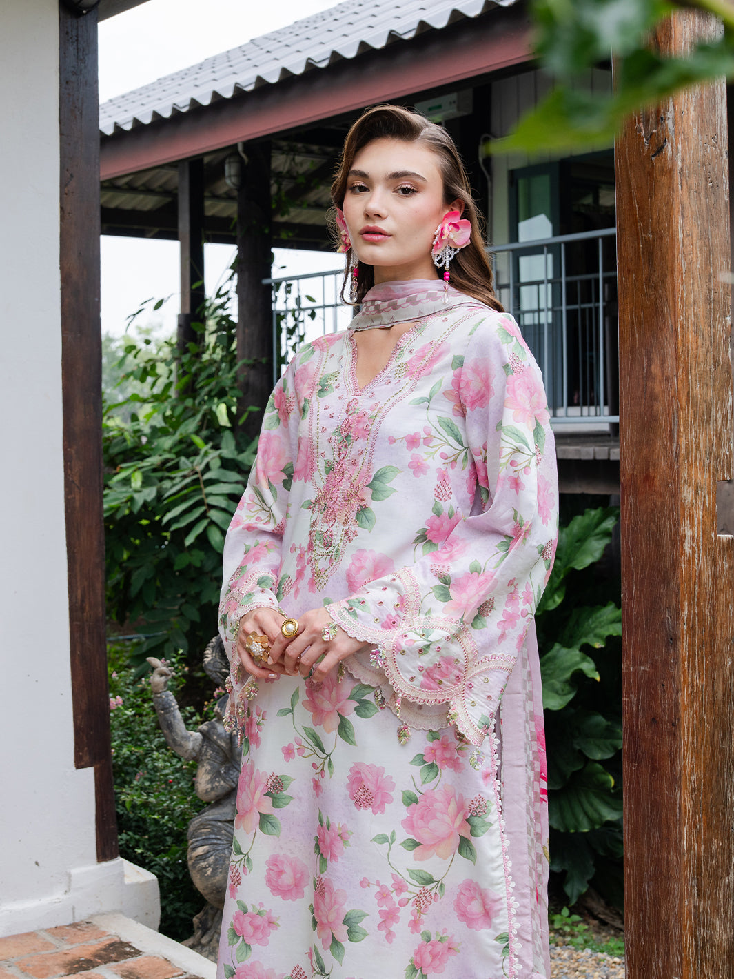 Buy a brown embroidered outfit online featuring a band collar, pleated front, baggy sleeves, and straight pants for an elegant, modern look.