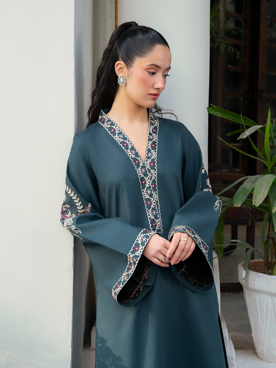 Buy a Noire black embroidered outfit online featuring a sleek collared neckline, intricate turquoise embroidery, and tailored straight pants for a refined look.