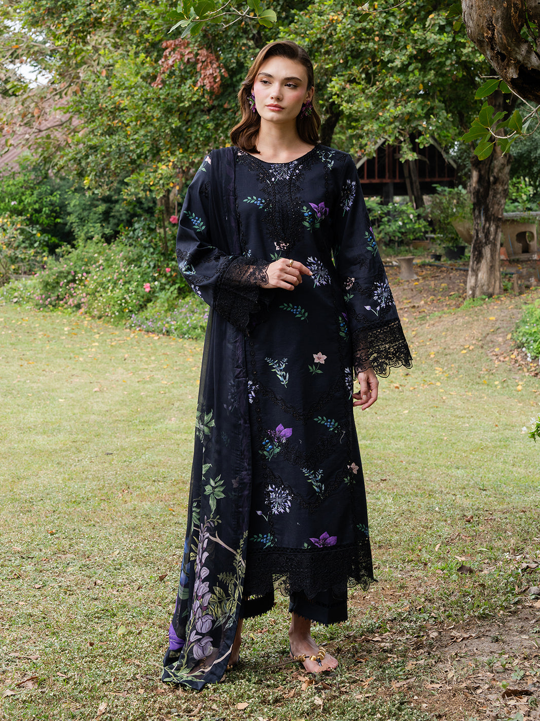 Meher â?? Black organza shirt with floral embroidery, hand embellishments, and a silk dupatta