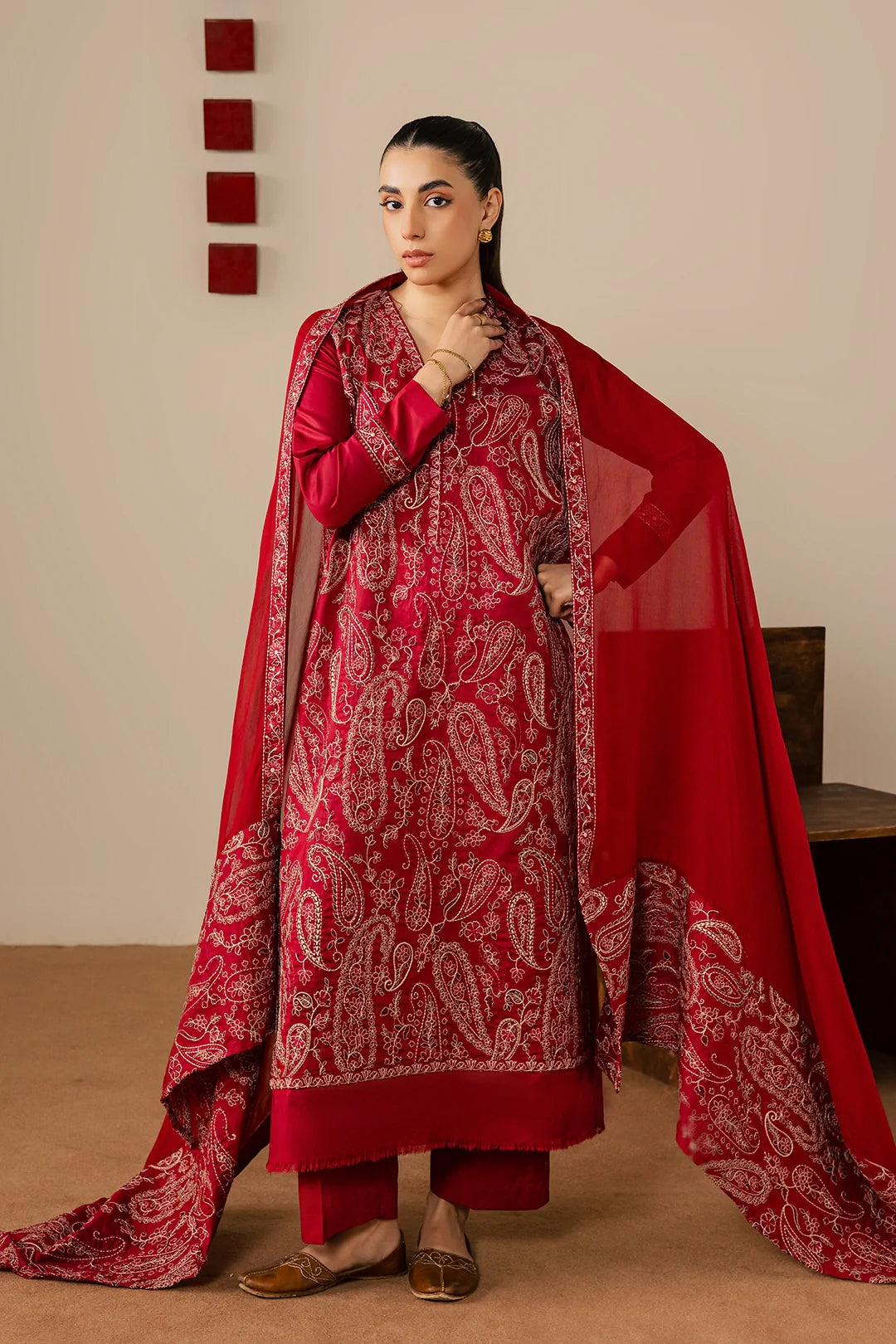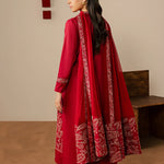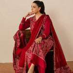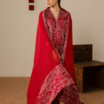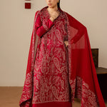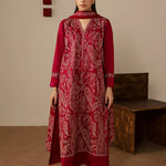 A striking three-piece maroon ensemble crafted in soft cotton, featuring a heavily embroidered shirt with beautifully detailed sleeves. Paired with wide trousers and a chiffon dupatta adorned with elegant embroidery and a wide border, this outfit is perfect for making a bold yet graceful statement at festive and formal occasions.