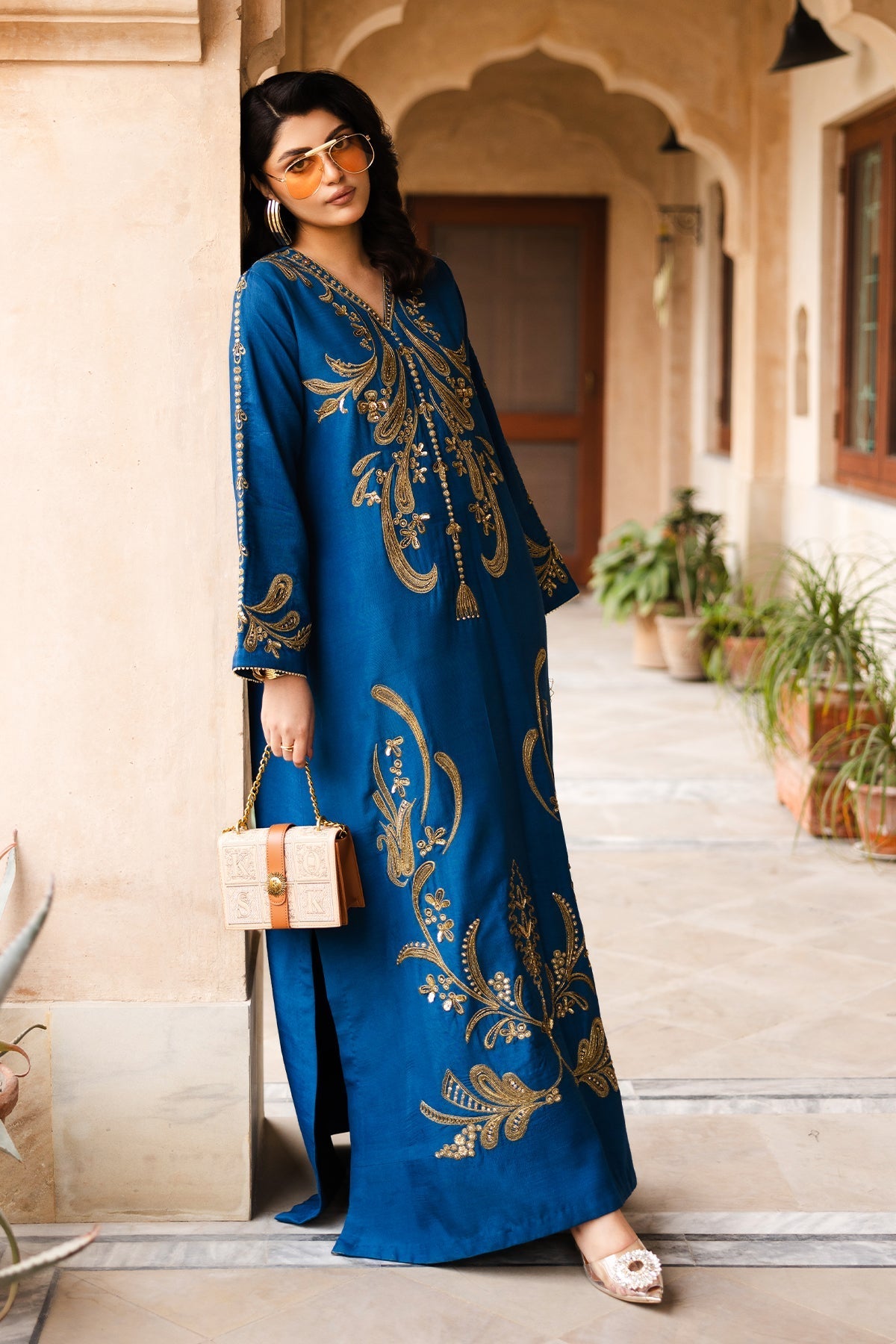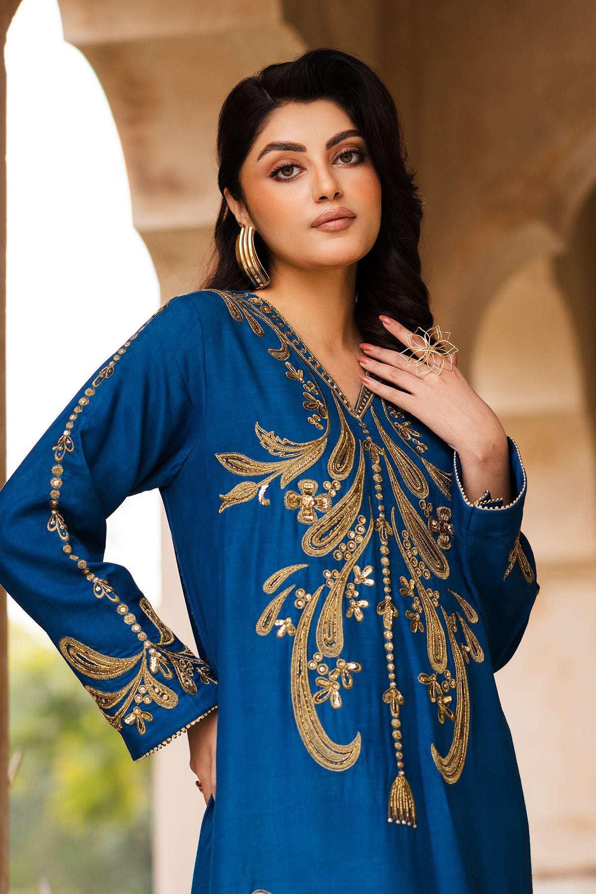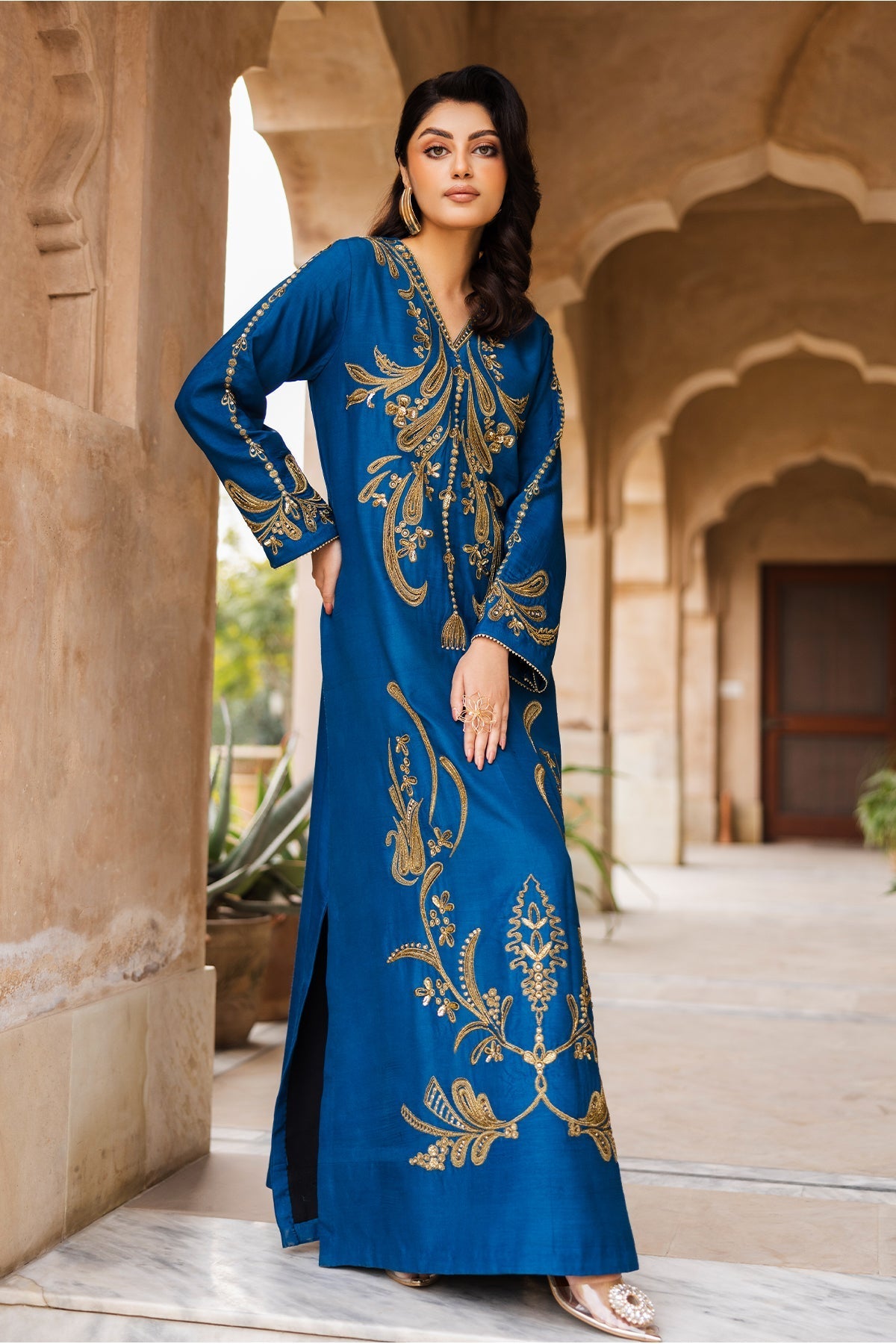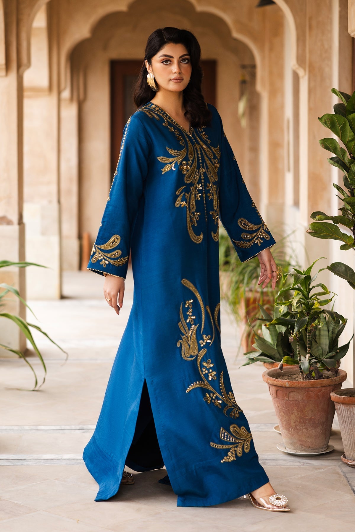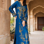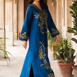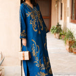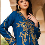 Make a statement with Zoya, a royal blue raw silk kaftan designed for elegance and luxury. The soft V-neckline and flowing silhouette create a graceful look, while the gold thread embroidery, inspired by baroque floral and vine motifs, adds a regal touch. The front bodice, sleeves, and hemline shimmer with hand-embellished cut dana, sequins, and crystals, making this outfit perfect for special occasions. Paired with straight raw silk pants, this ensemble is a blend of effortless style and sophistication.