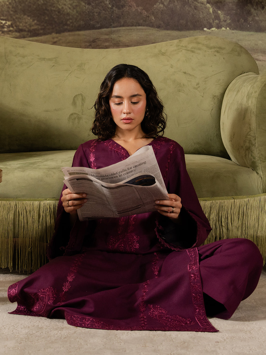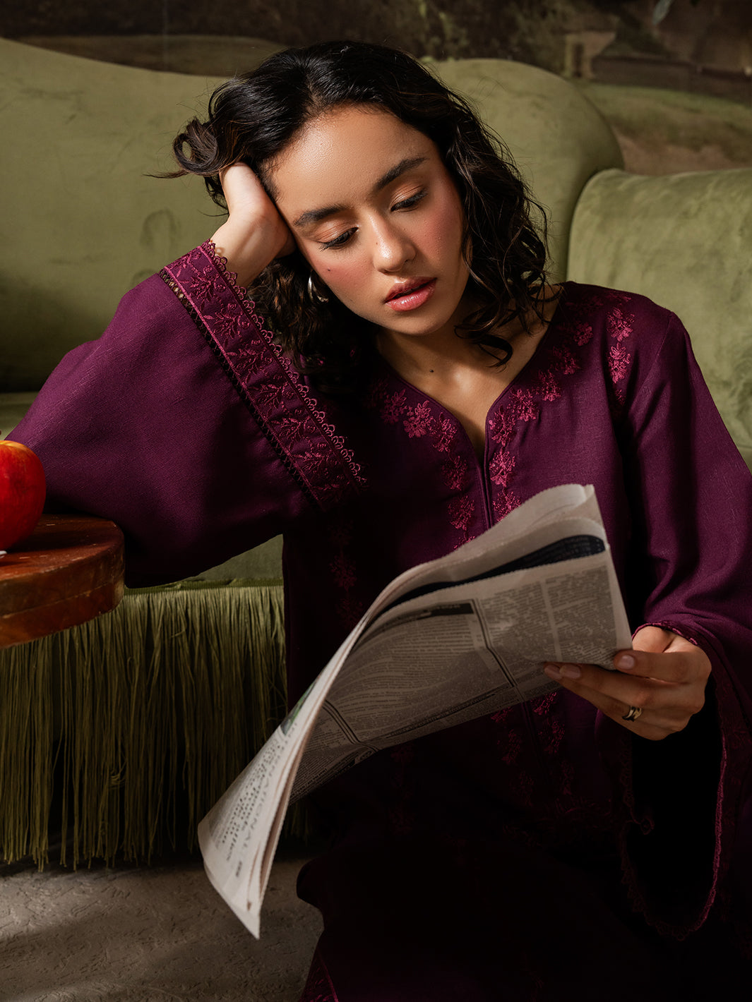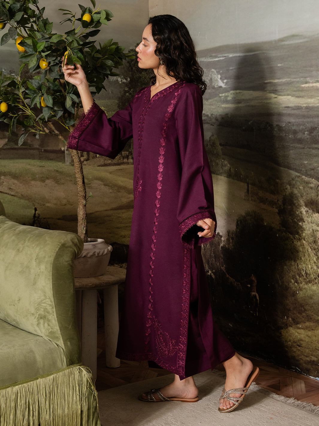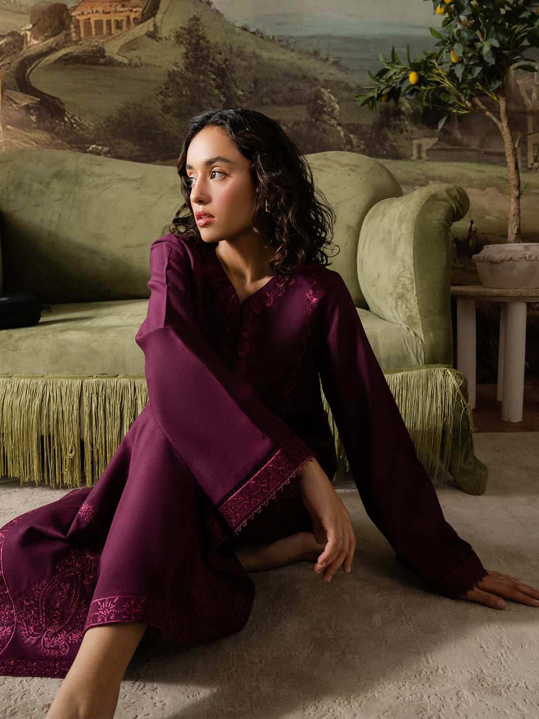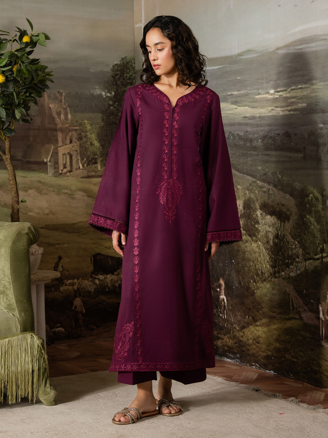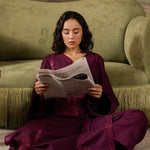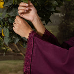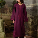 Callista is an expression of elegance painted in rich plum tones. This stitched two-piece Karandi ensemble is adorned with finely detailed embroidery that runs along the neckline, sleeves, and borders, echoing the precision of an artist’s brushwork.