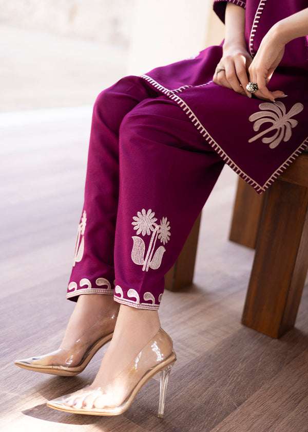 Make a bold statement with COCO, a striking magenta two-piece ensemble that redefines effortless elegance. The straight-cut shirt is adorned with delicate powder pink embroidered motifs, creating a stunning contrast that enhances its sophisticated appeal. Intricate stitched detailing further elevates the design, adding a touch of refinement.