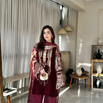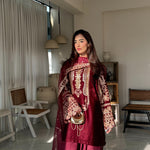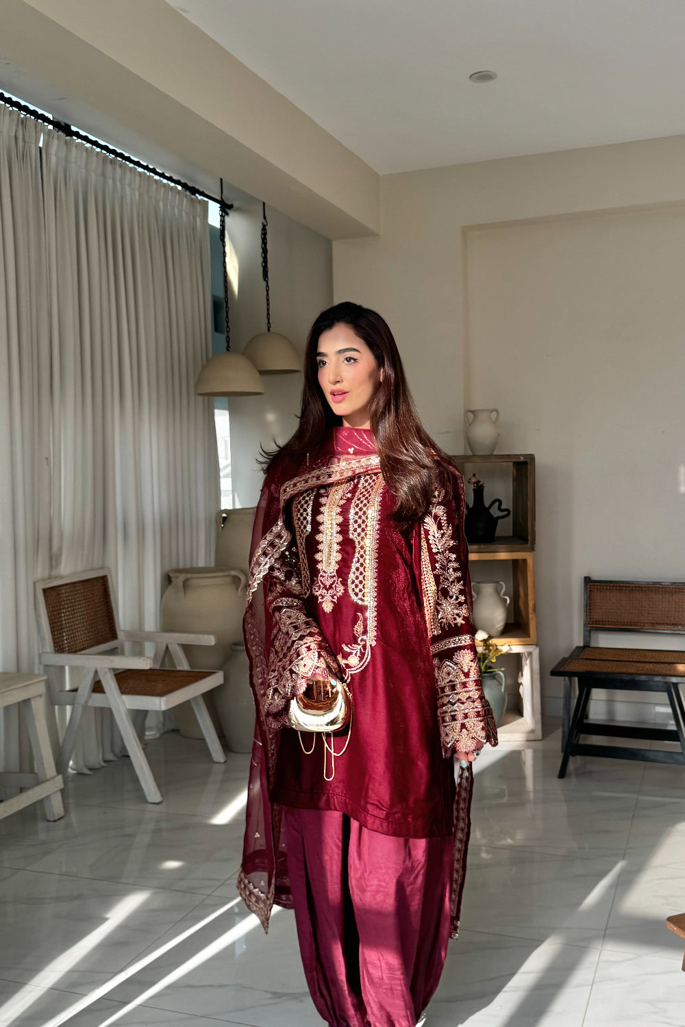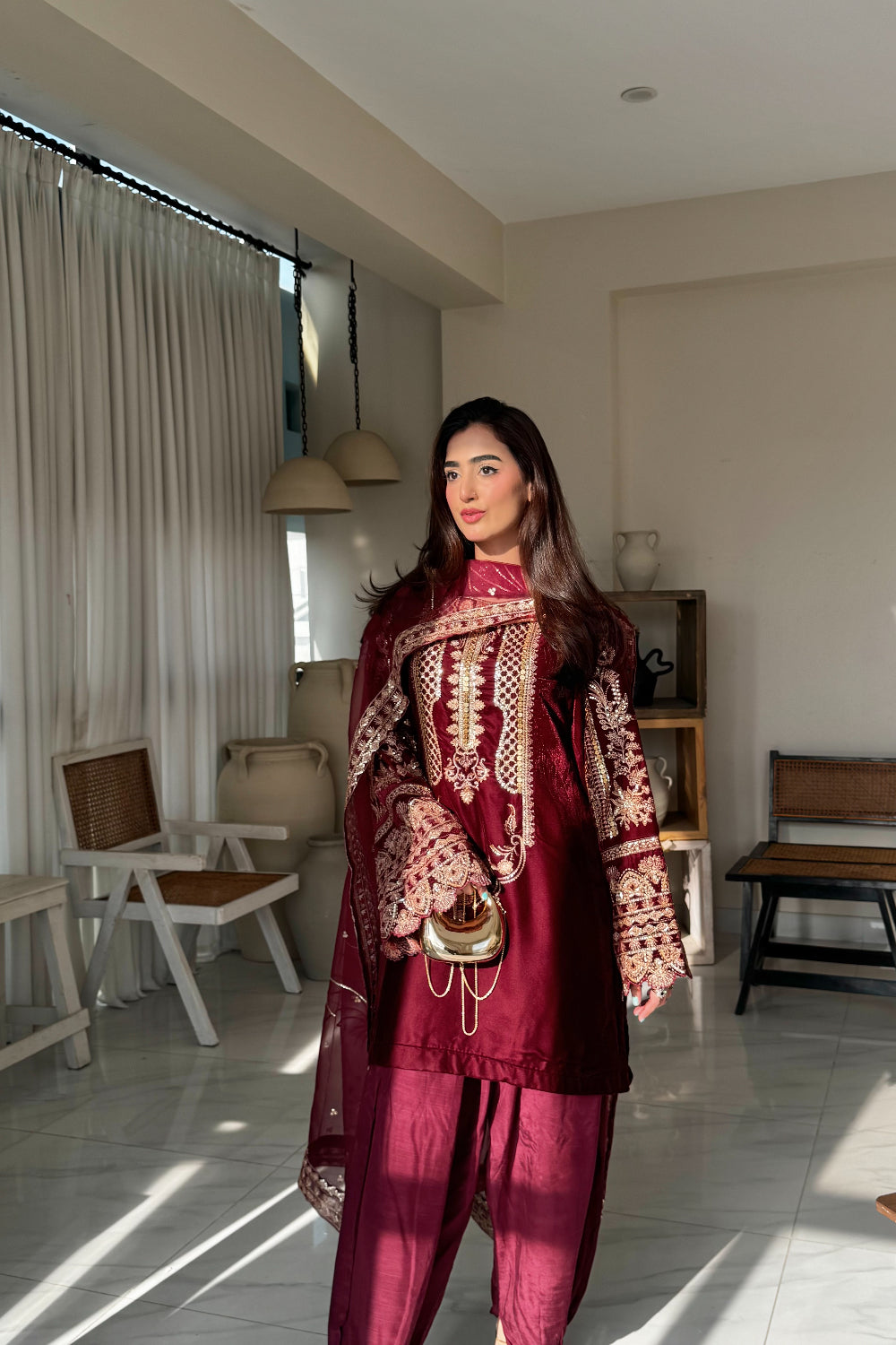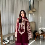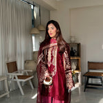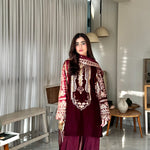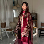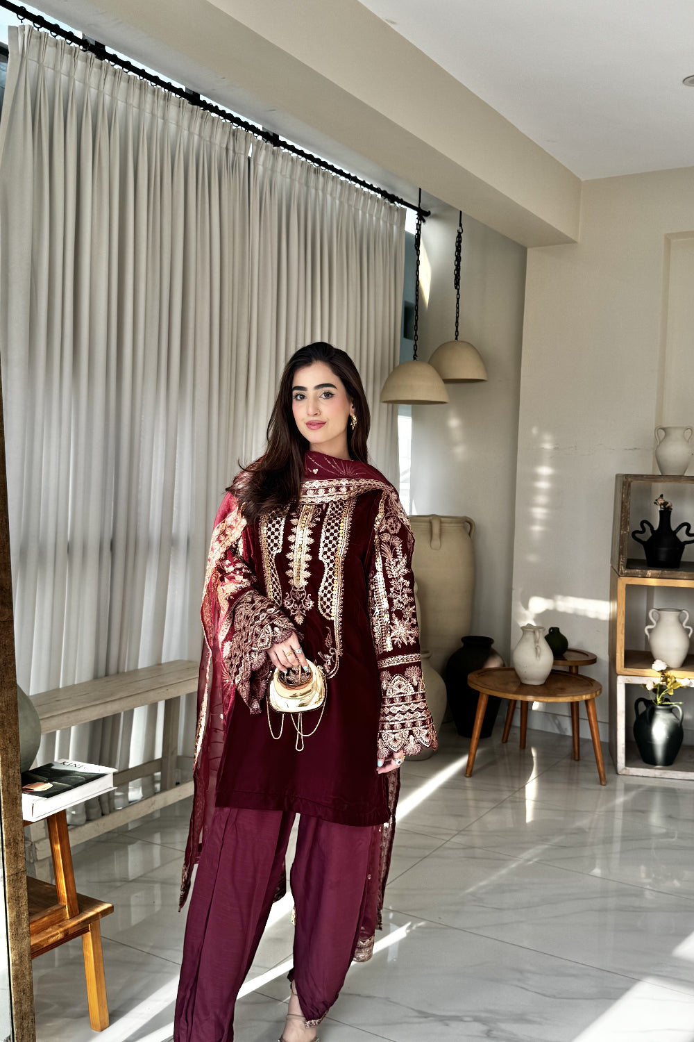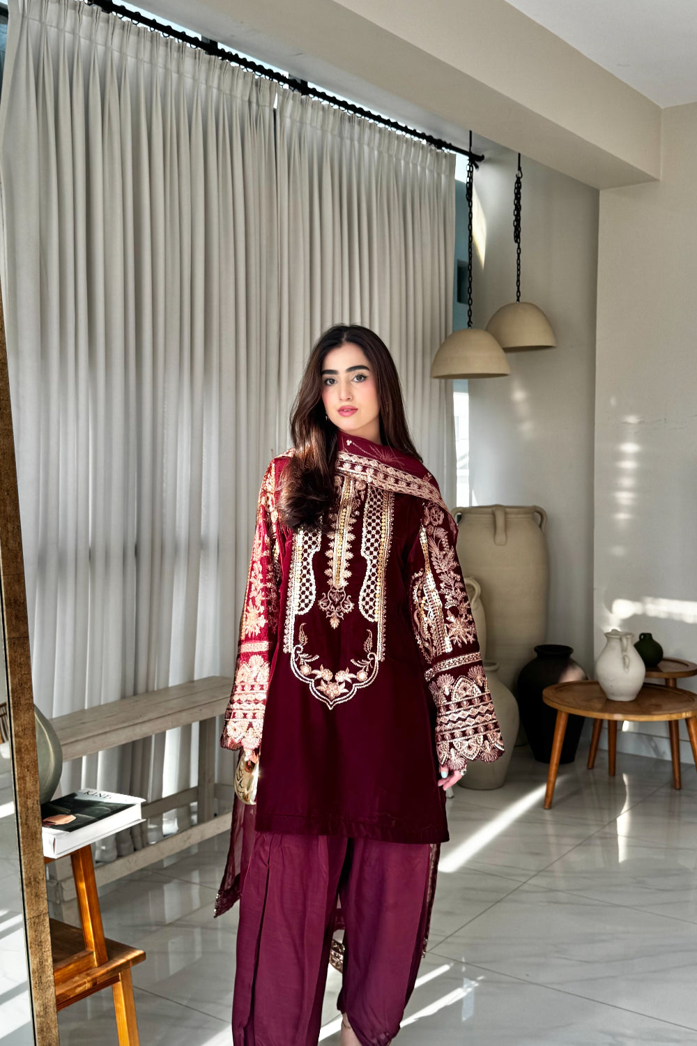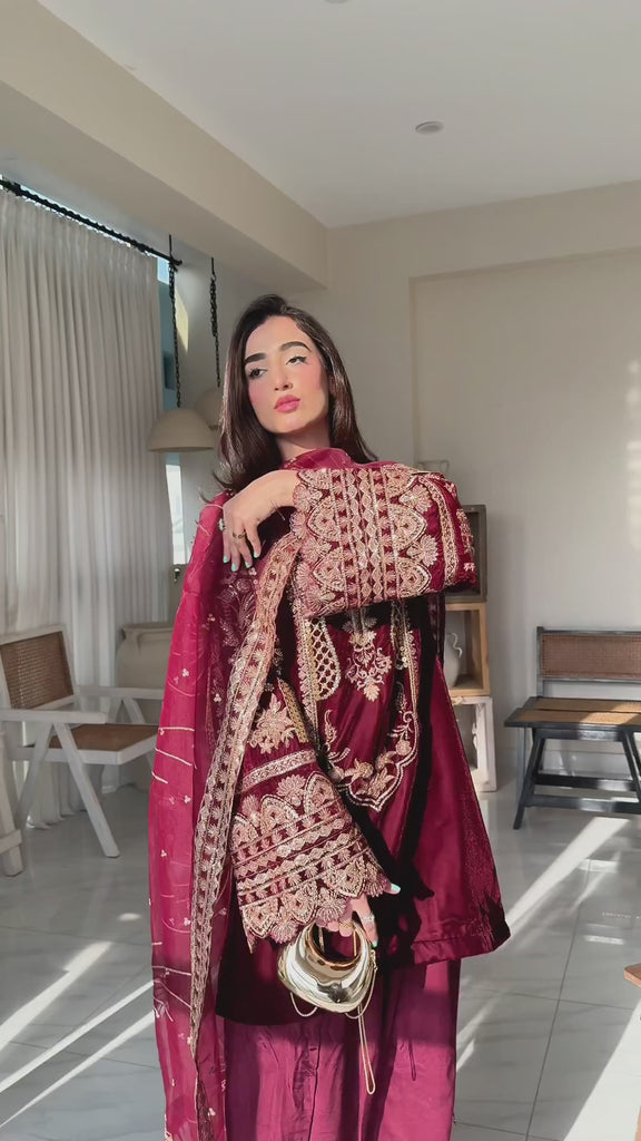 Step into elegance with this deep red velvet dress, showcasing exquisite golden embroidery along the sleeves, front, and matching dupatta. Perfect for festive occasions, this ensemble combines rich color with intricate details for a truly regal look.
