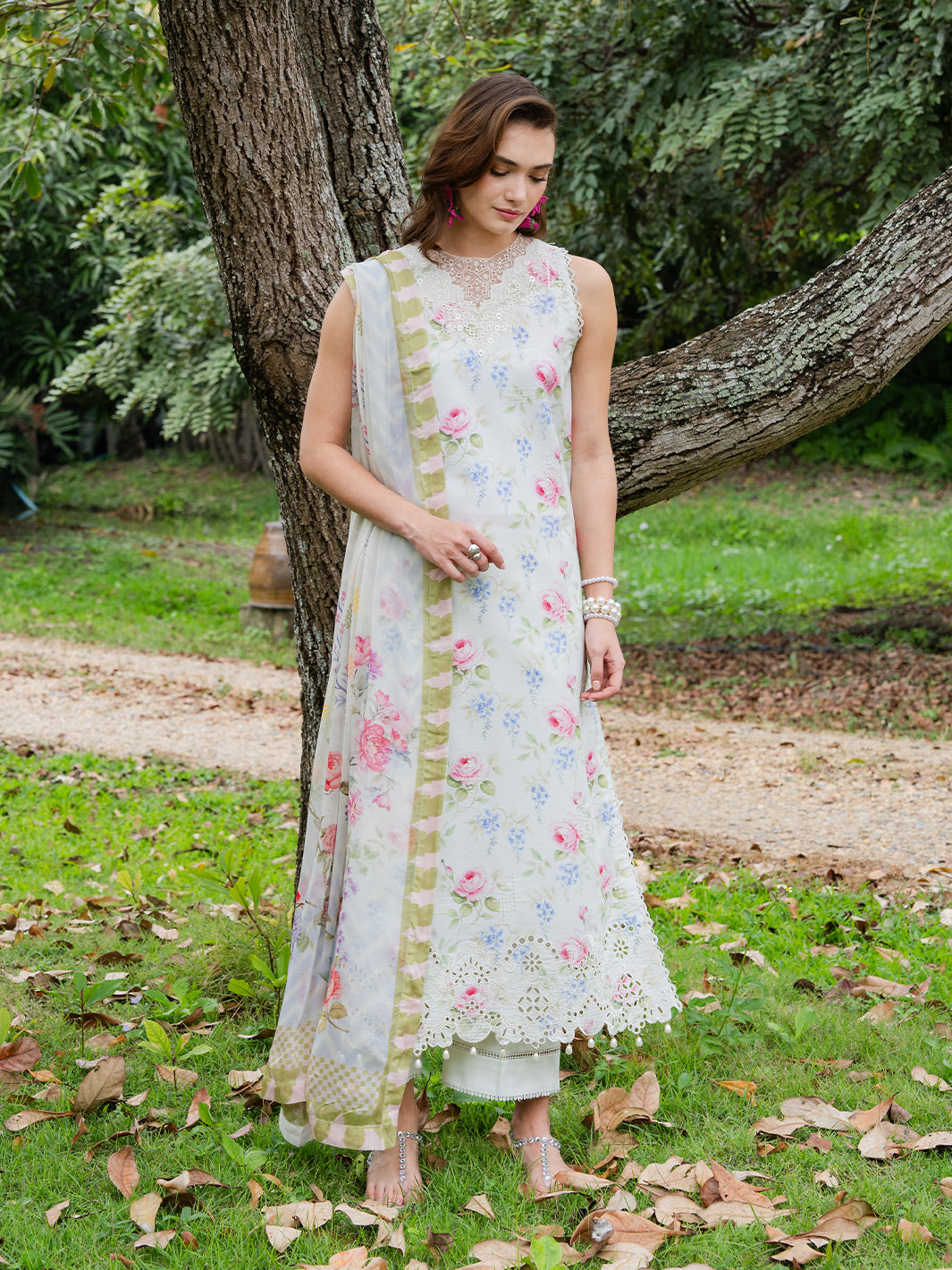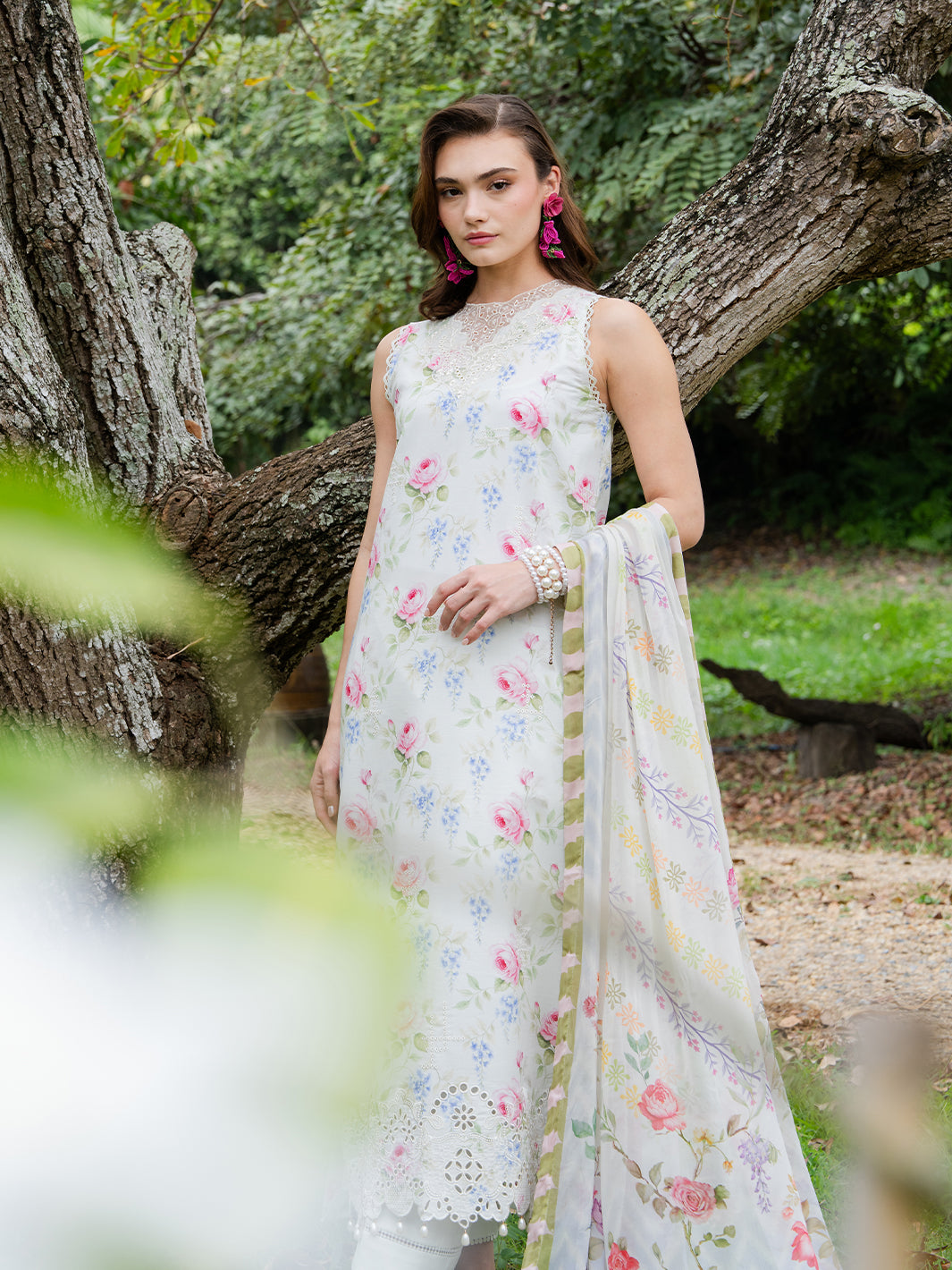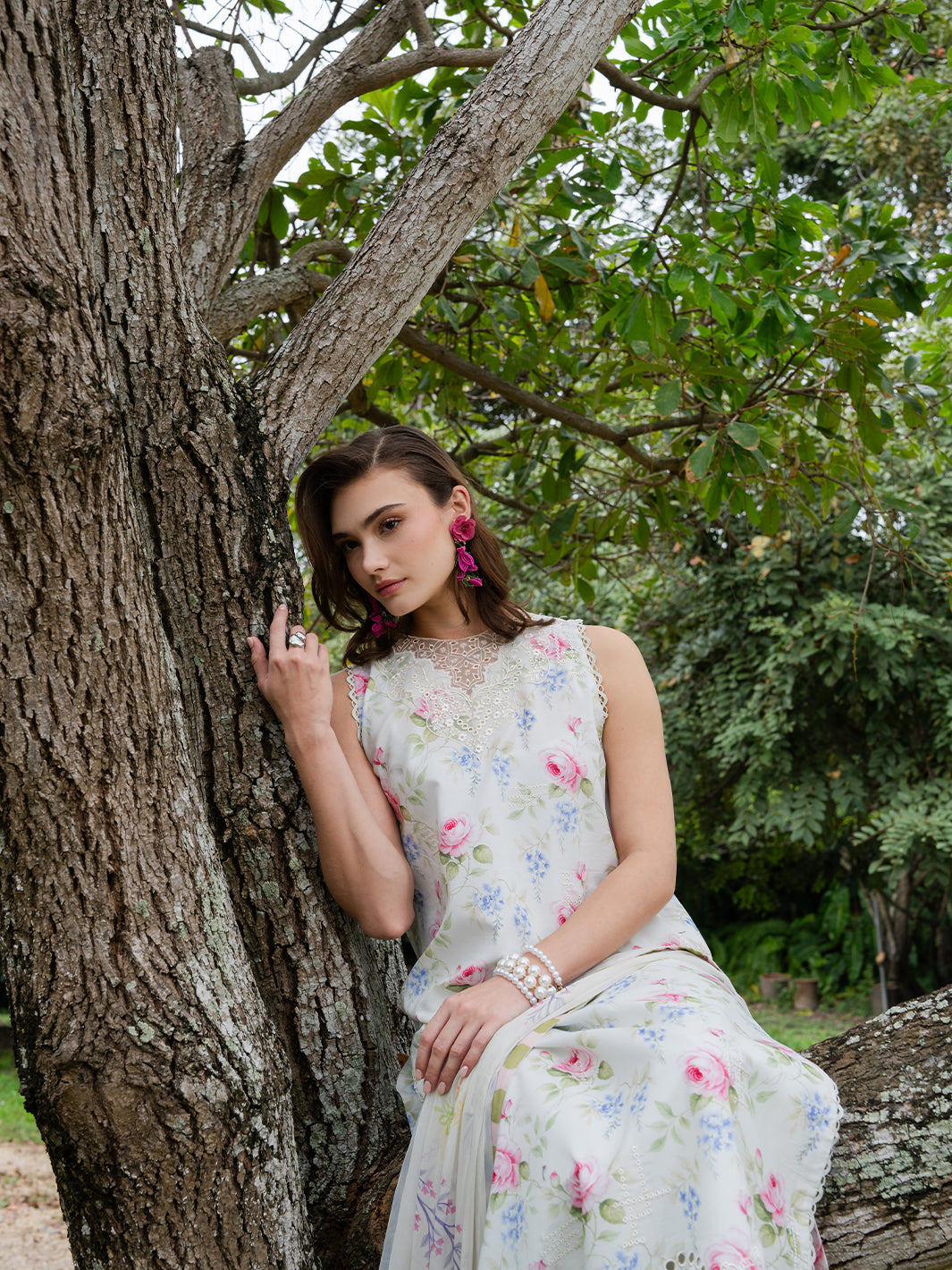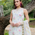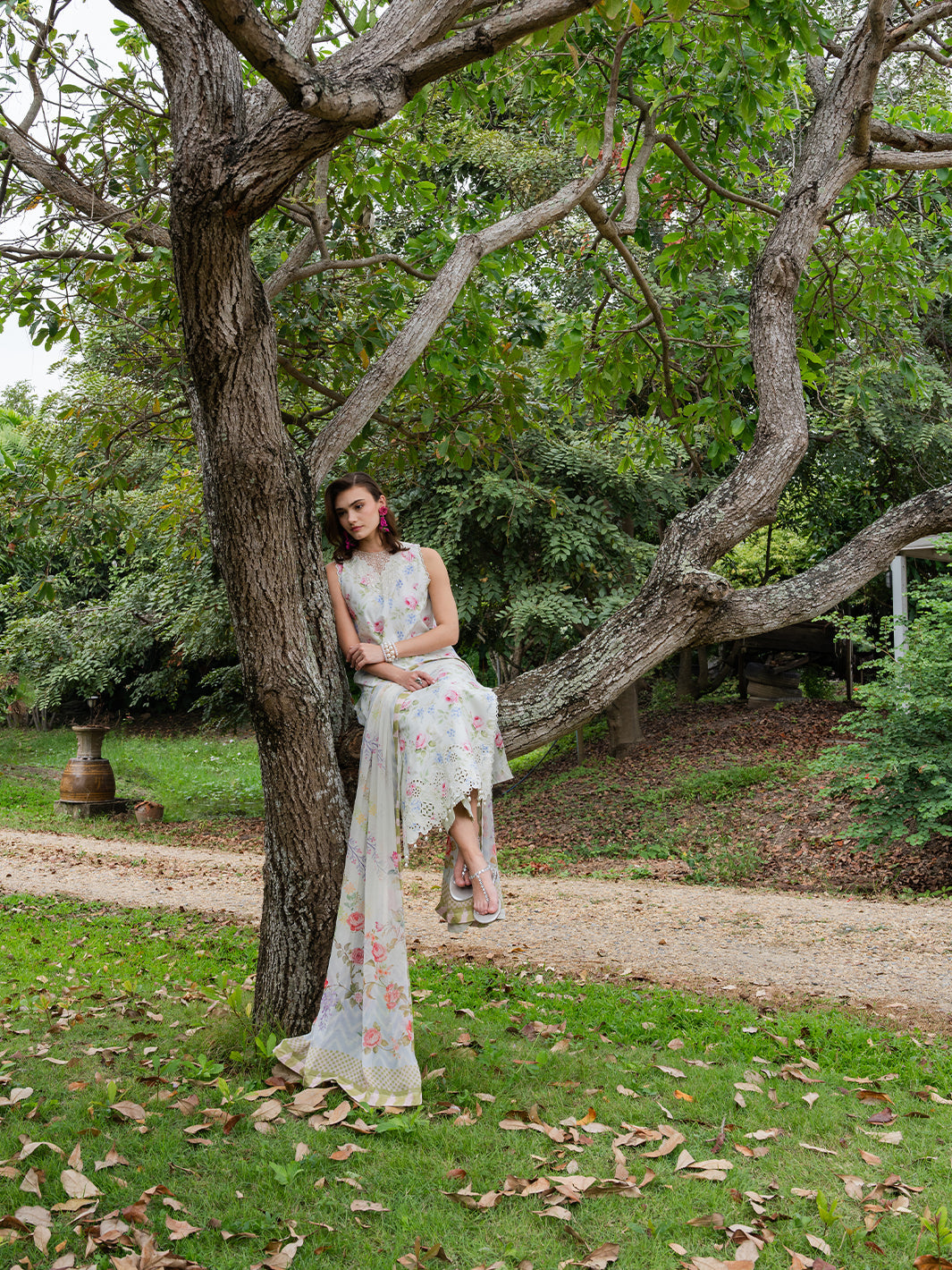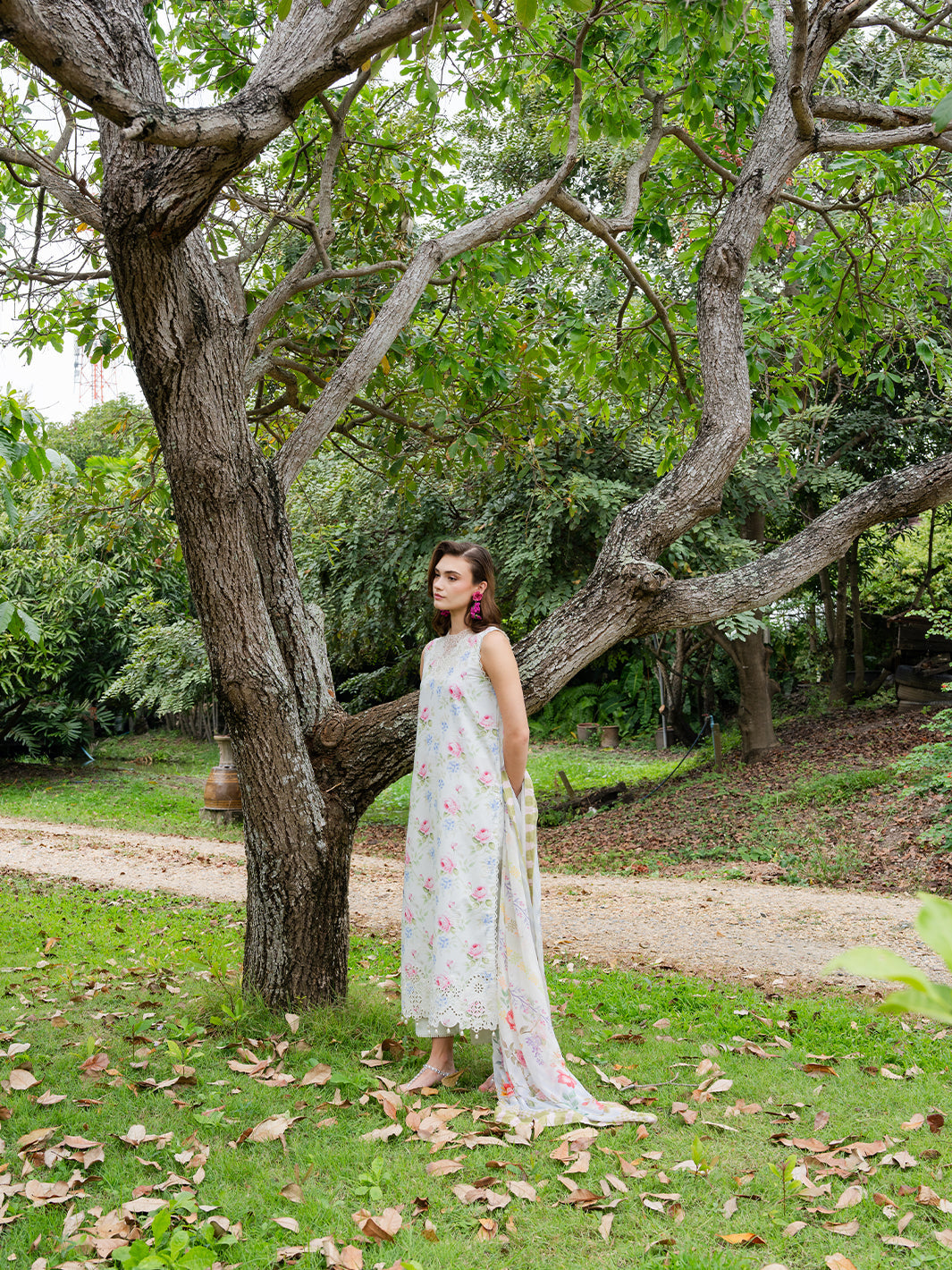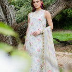 Crafted on breathable lawn, the shirt features delicate printed florals with embroidered accents that add subtle texture and grace. An embroidered organza neckline enhances the silhouette with refined detail, while the printed chiffon dupatta flows effortlessly, echoing the softness of spring mornings. Finished with a plain dyed trouser, Florent is an ode to quiet elegance and effortless femininity.