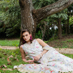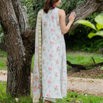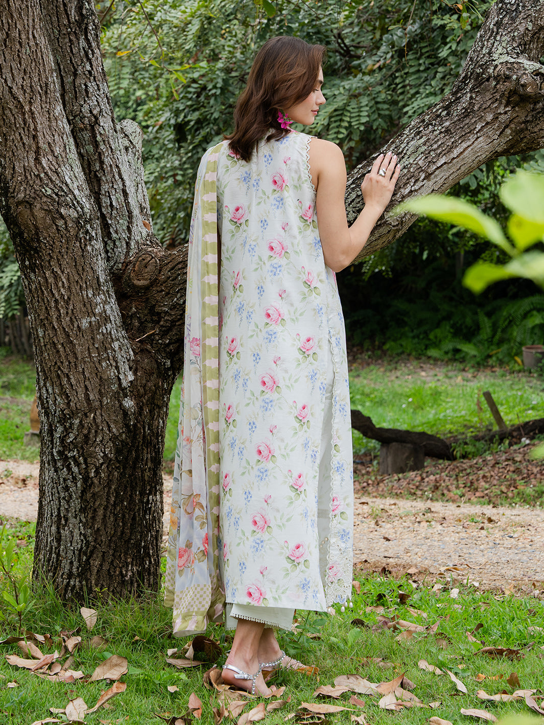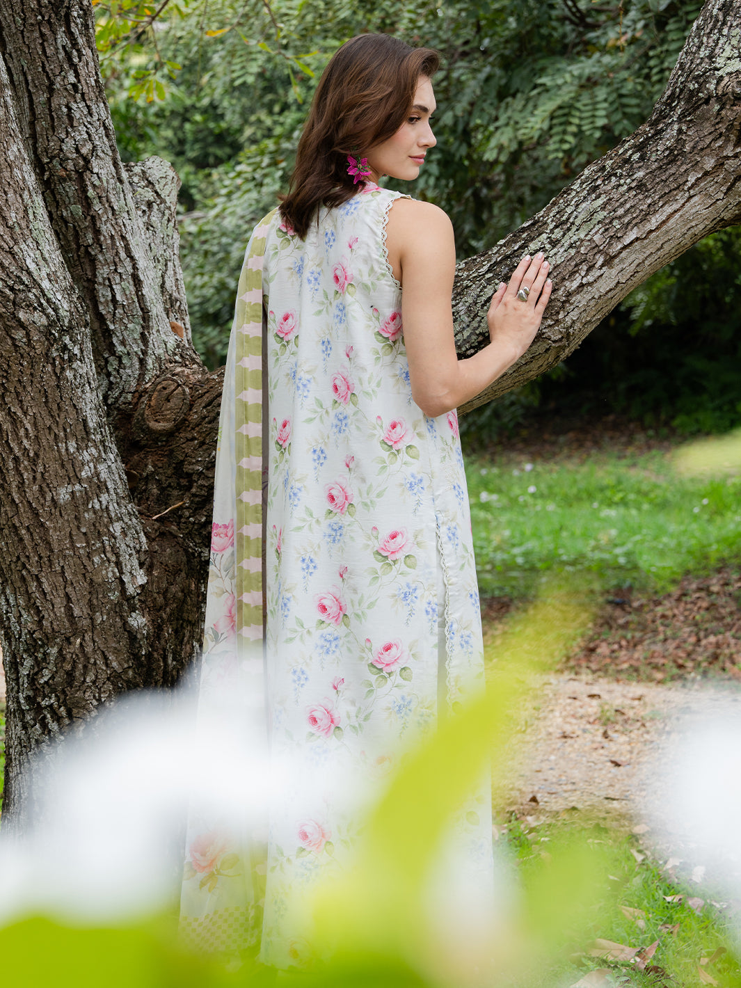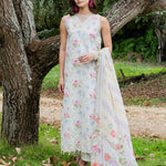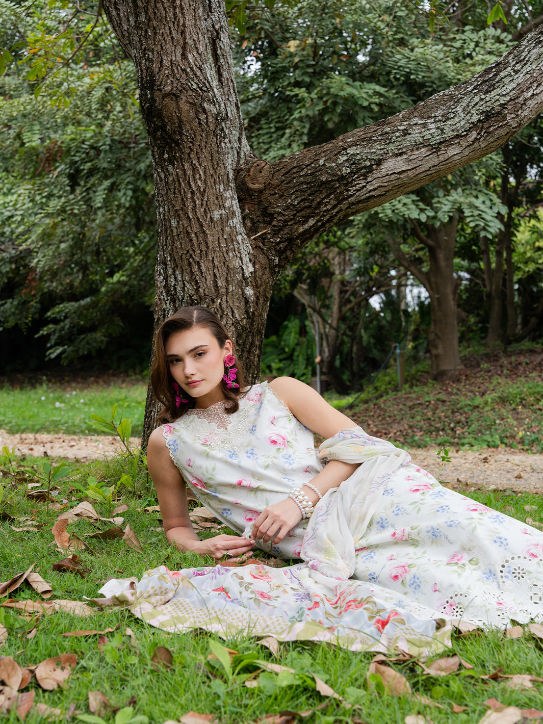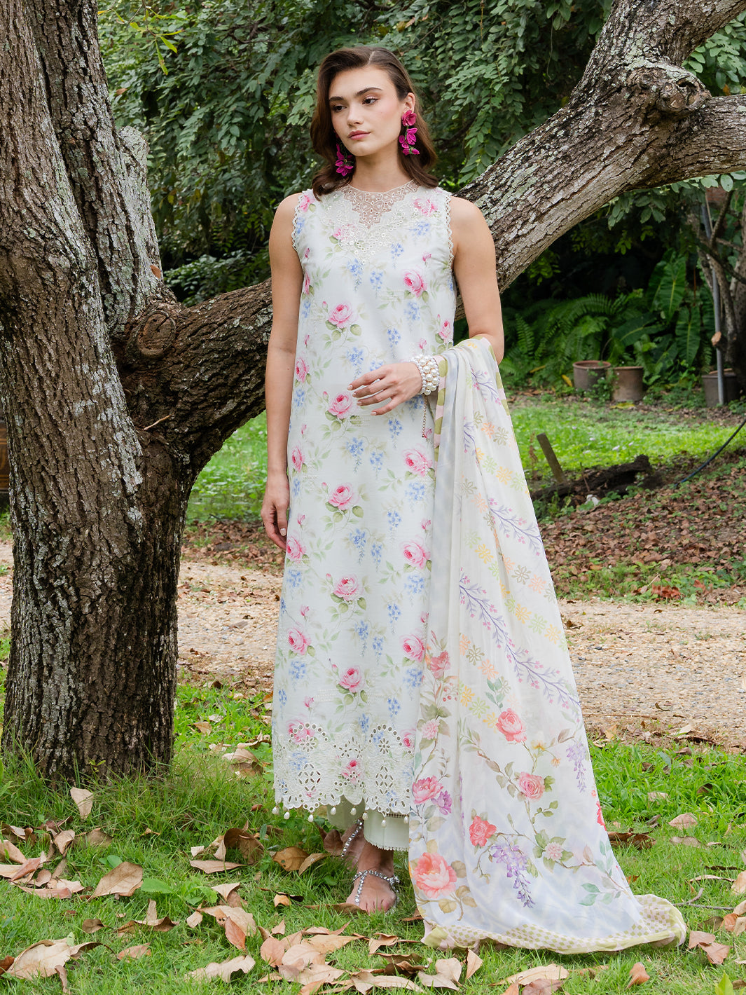 Crafted on breathable lawn, the shirt features delicate printed florals with embroidered accents that add subtle texture and grace. An embroidered organza neckline enhances the silhouette with refined detail, while the printed chiffon dupatta flows effortlessly, echoing the softness of spring mornings. Finished with a plain dyed trouser, Florent is an ode to quiet elegance and effortless femininity.