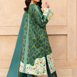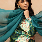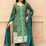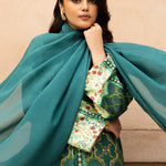 Step into elegance with Arwa, a teal green raw silk outfit designed for those who appreciate fine craftsmanship. The straight-cut silhouette showcases intricate adda work, including gota, dori, cut dana, sequins, and crystals, adding texture and depth to the design. The gold geometric patterns and floral borders in vibrant hues at the hem enhance the luxurious appeal. Complementing the shirt is a matching raw silk trouser with gota detailing, while the medium silk dupatta with organza pallus and hand-placed sequins provides a graceful, delicate shimmer.