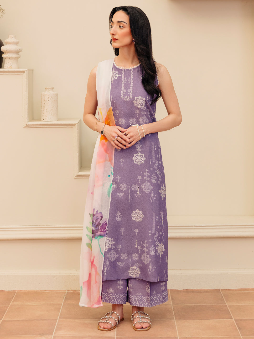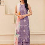 Soft lilac meets winter grace in Ira, a soothing ensemble that blends comfort with understated charm. Crafted in Karandi, the shirt and trousers are adorned with subtle embroidered motifs, creating a look that is as serene as it is elegant.