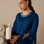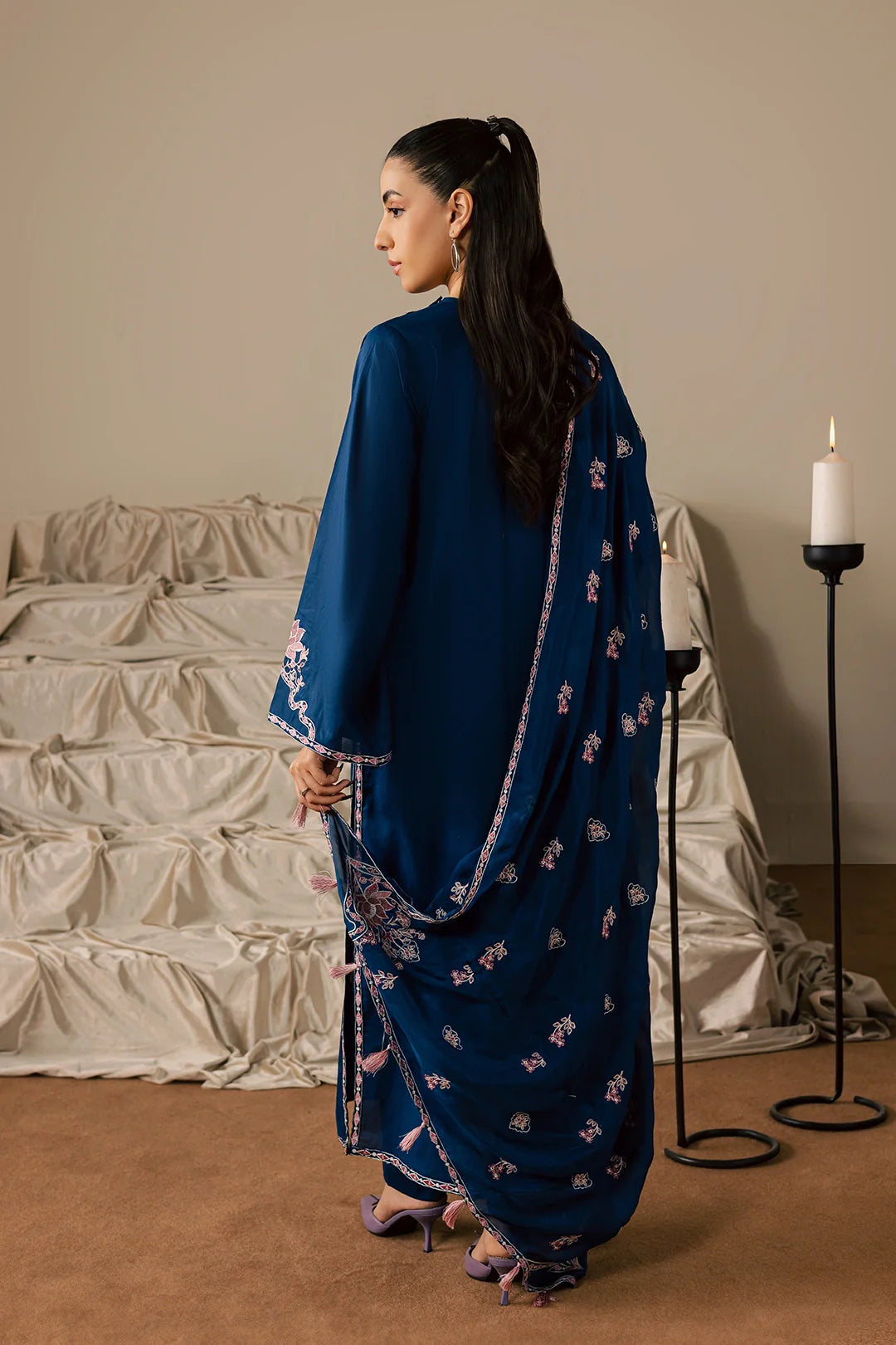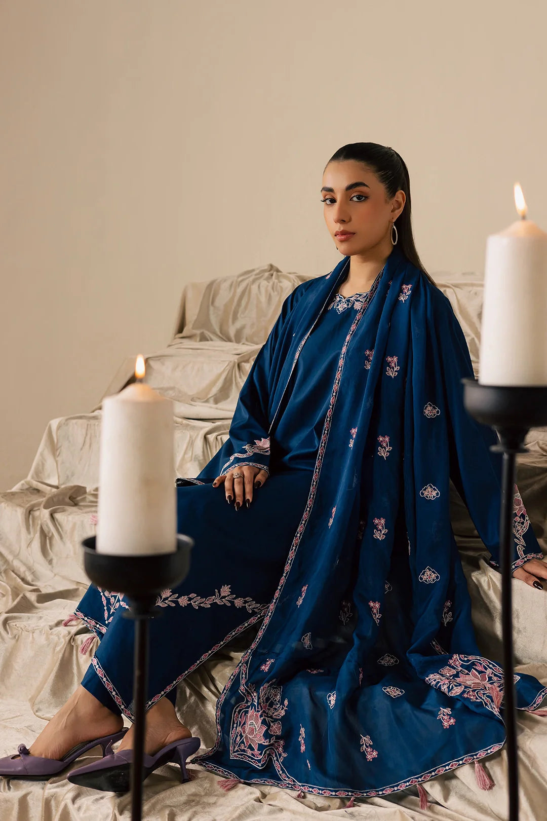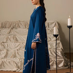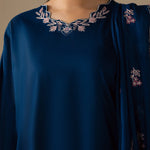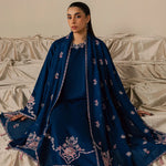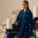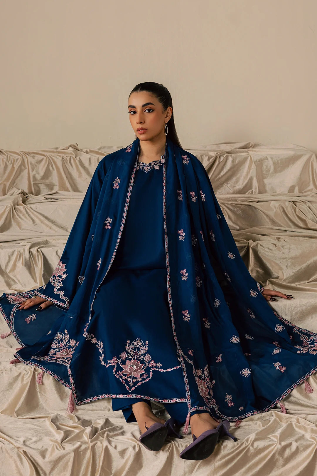 A sophisticated three-piece navy blue ensemble crafted in soft cotton, featuring a long embroidered shirt with beautifully detailed sleeves. Paired with matching trousers and a silk embroidered dupatta, this outfit offers a timeless and elegant look, perfect for formal and festive occasions.