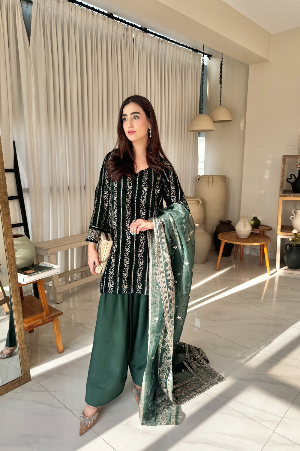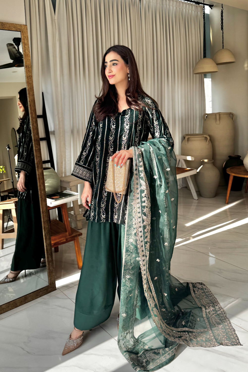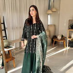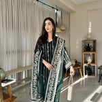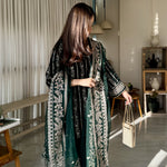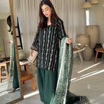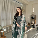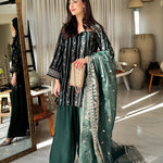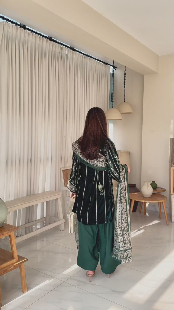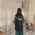 Radiate timeless elegance in this deep green velvet dress, lavishly adorned with golden embroidery across the entire suit and matching dupatta. The intricate detailing enhances the rich velvet base, creating a striking blend of luxury and grace, perfect for festive gatherings and grand celebrations.