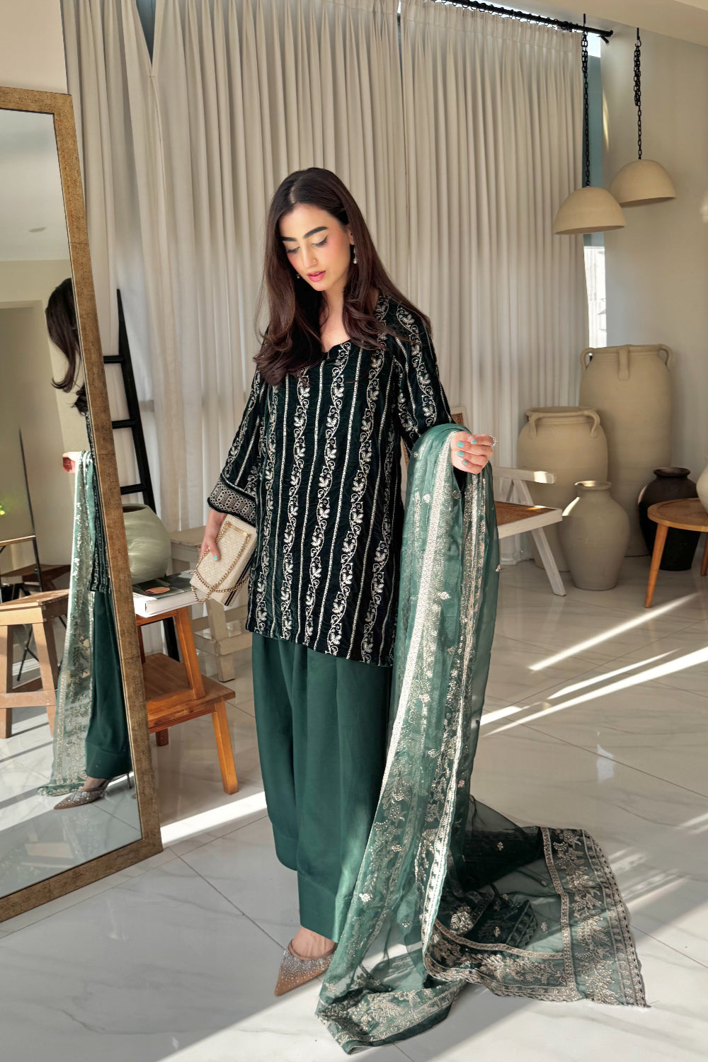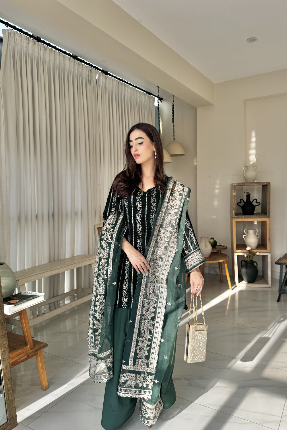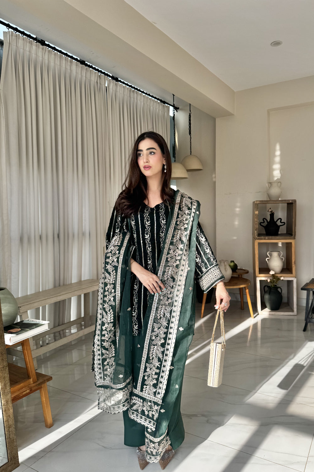Radiate timeless elegance in this deep green velvet dress, lavishly adorned with golden embroidery across the entire suit and matching dupatta. The intricate detailing enhances the rich velvet base, creating a striking blend of luxury and grace, perfect for festive gatherings and grand celebrations.