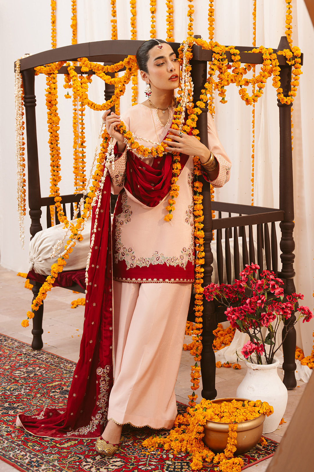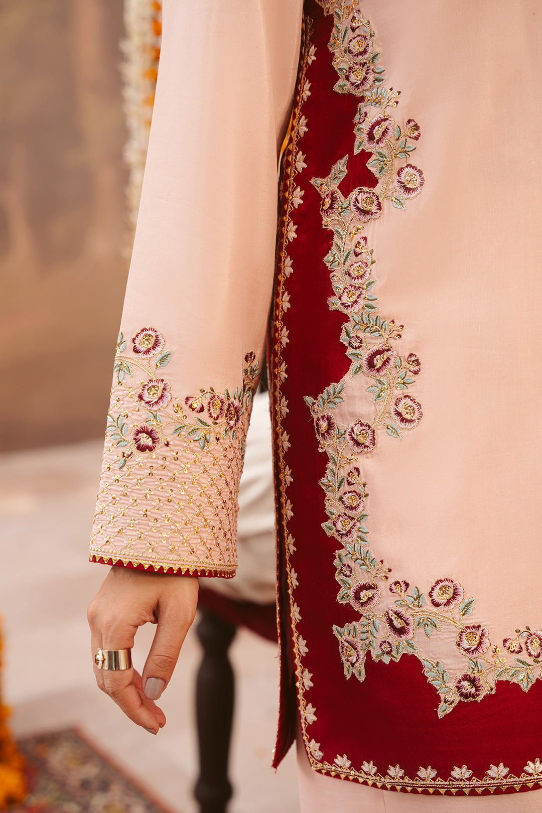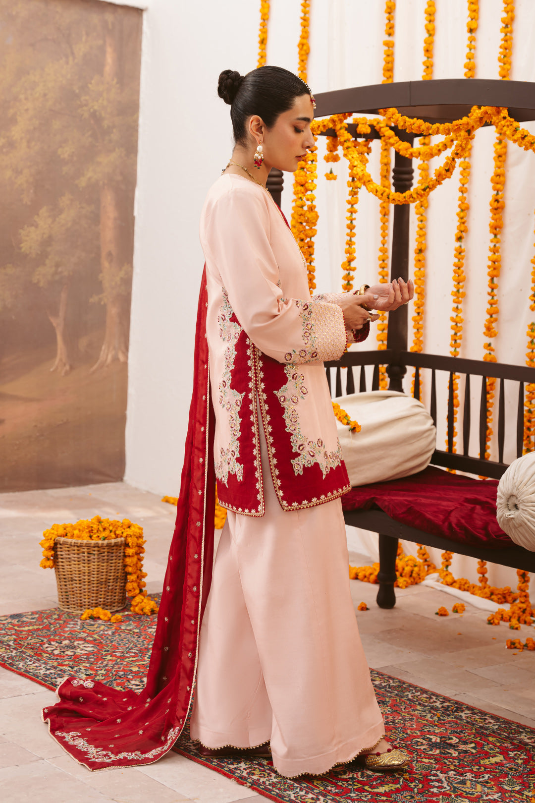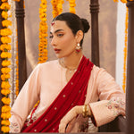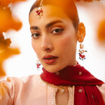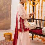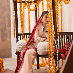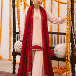 This two-tonal, soft peach three-piece ensemble features a short raw silk shirt, beautifully defined by a contrasting red color-blocked hem on both the front and back. Styled for seamless continuity, it is paired with matching trousers detailed with delicate scalloped embroidery and completed with an embroidered red silk dupatta, creating a refined and elegant festive look.