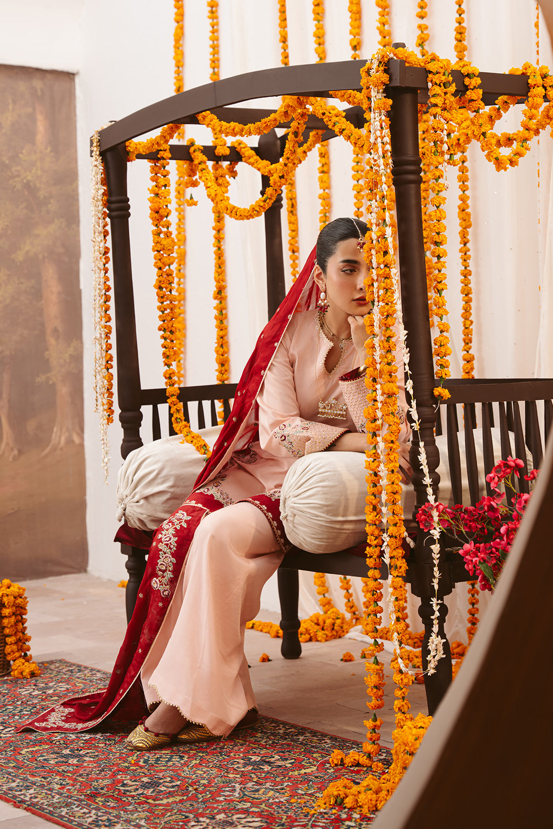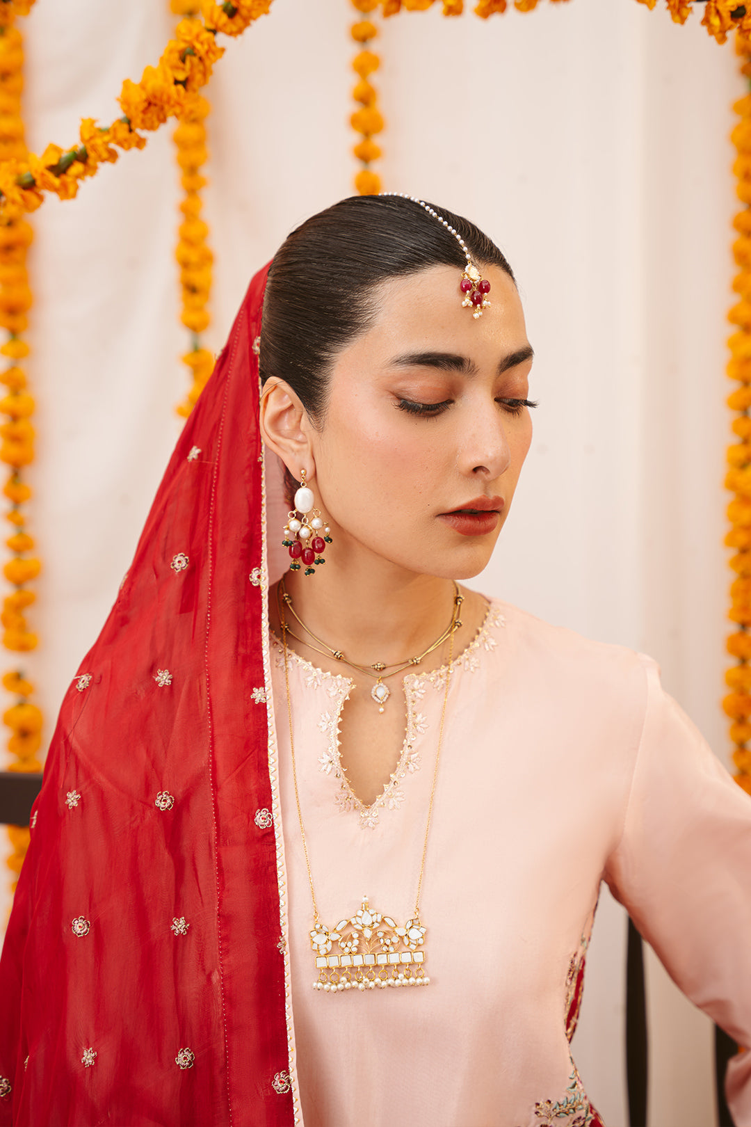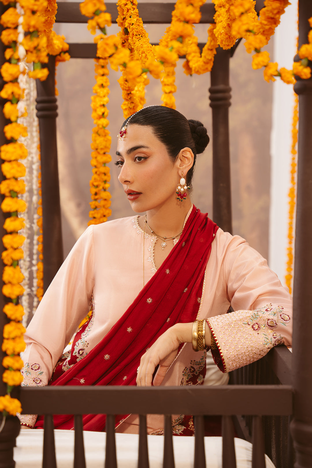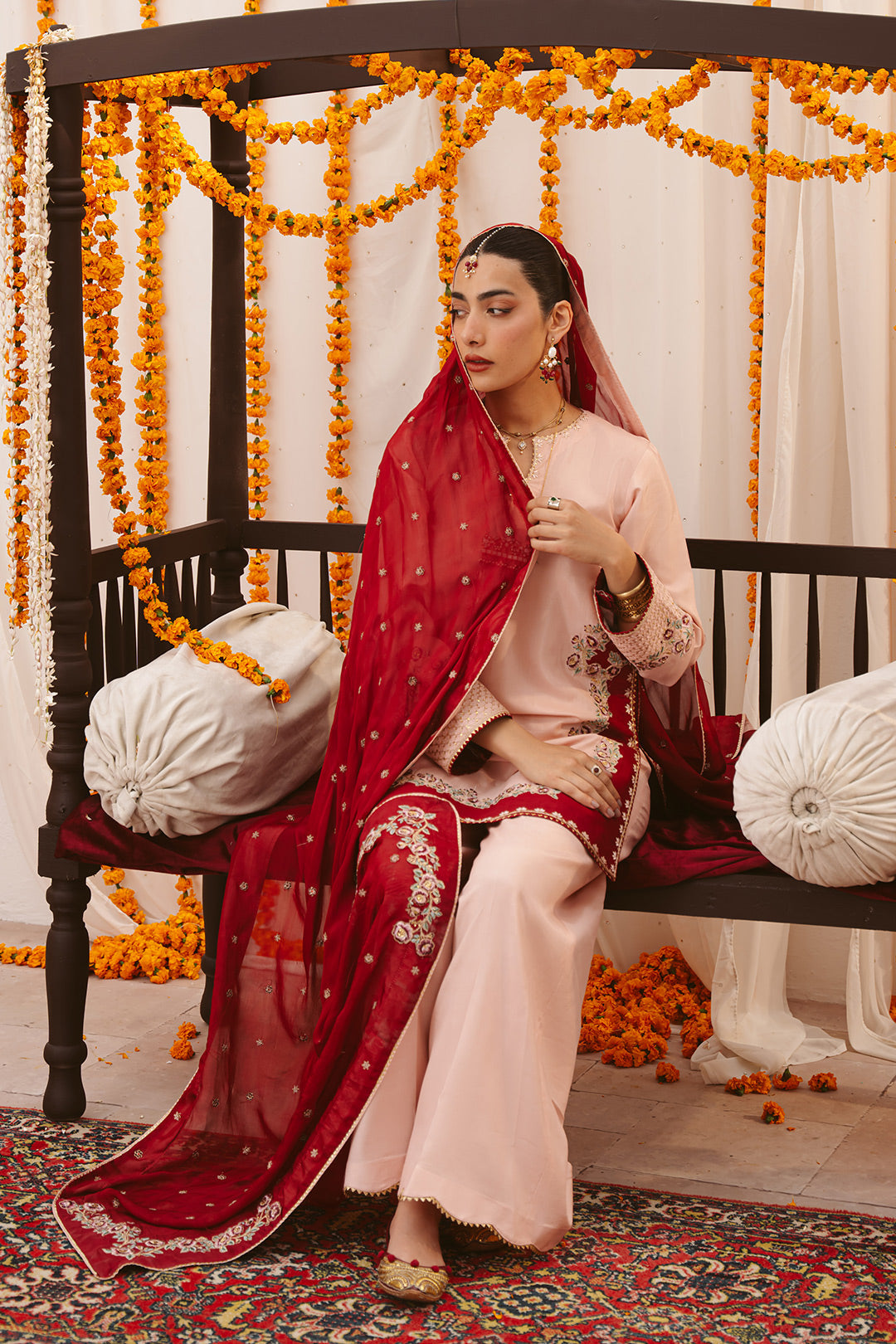 This two-tonal, soft peach three-piece ensemble features a short raw silk shirt, beautifully defined by a contrasting red color-blocked hem on both the front and back. Styled for seamless continuity, it is paired with matching trousers detailed with delicate scalloped embroidery and completed with an embroidered red silk dupatta, creating a refined and elegant festive look.
