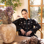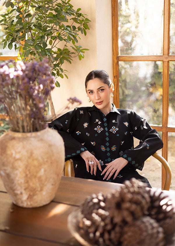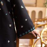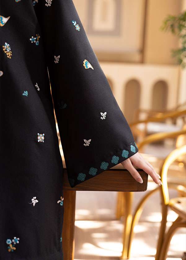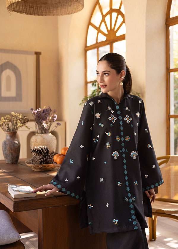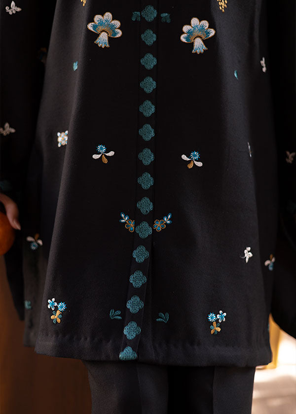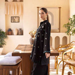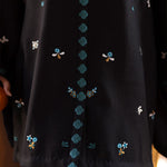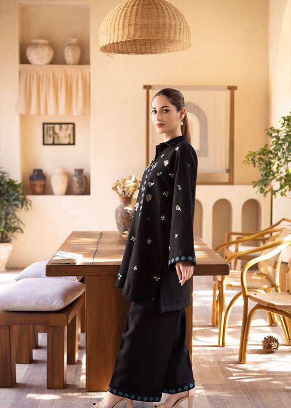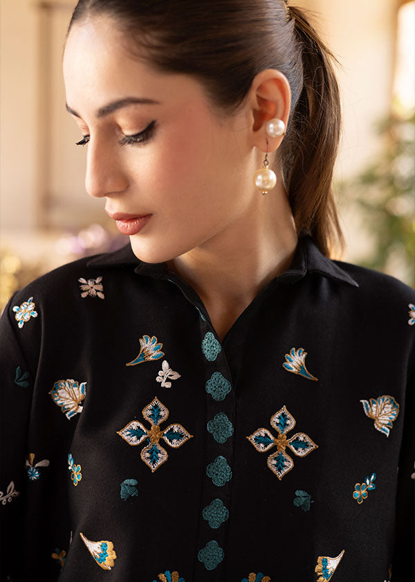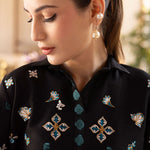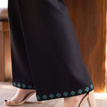 Exude timeless sophistication with the Noire ensemble a sleek black outfit designed for effortless elegance. The collared neckline is enhanced by an intricately embroidered center patti, showcasing turquoise, brown, and white detailing for a striking contrast. Paired with tailored straight pants, this outfit embodies grace, refinement, and contemporary charm.