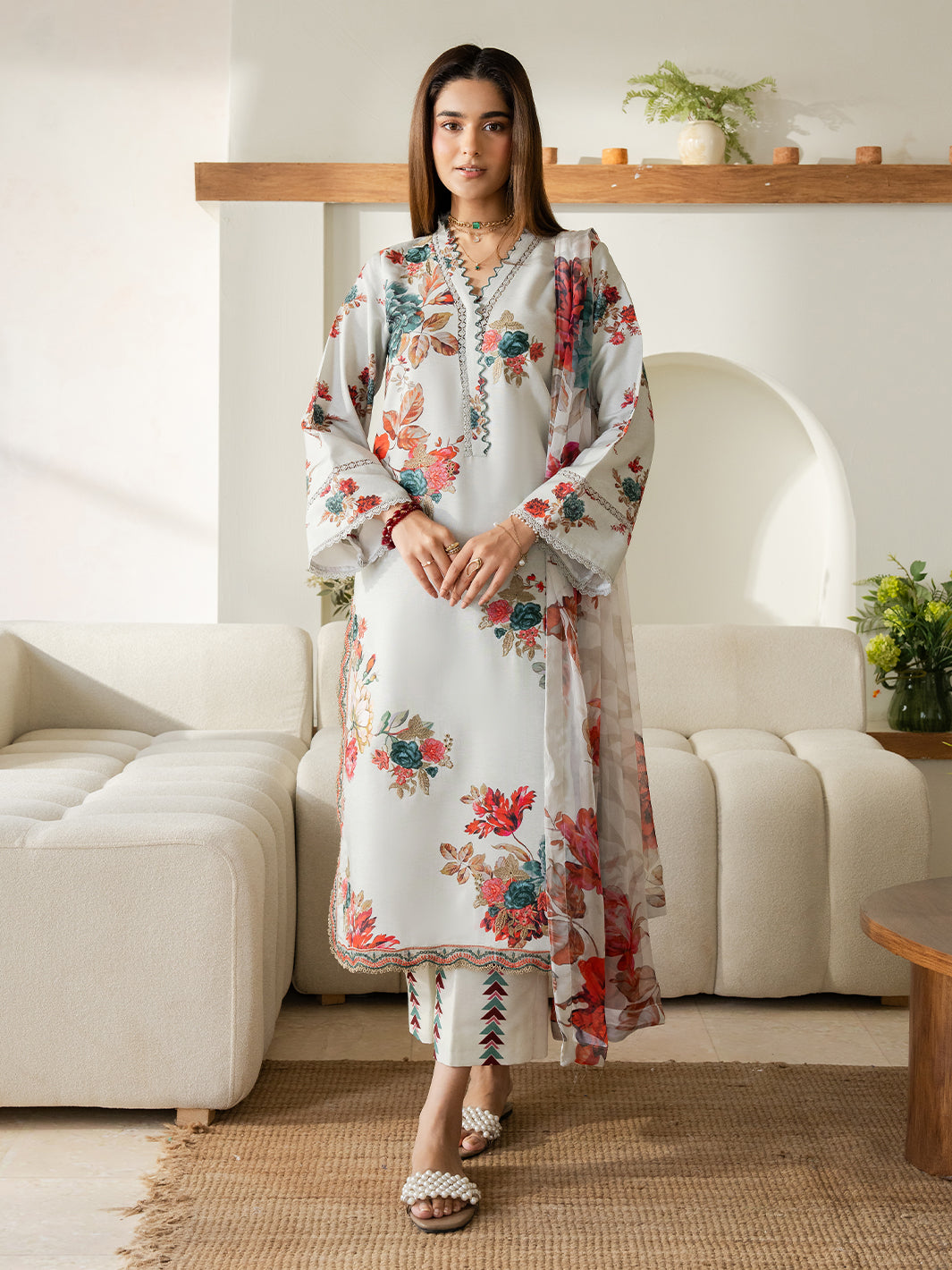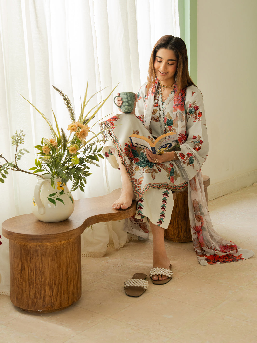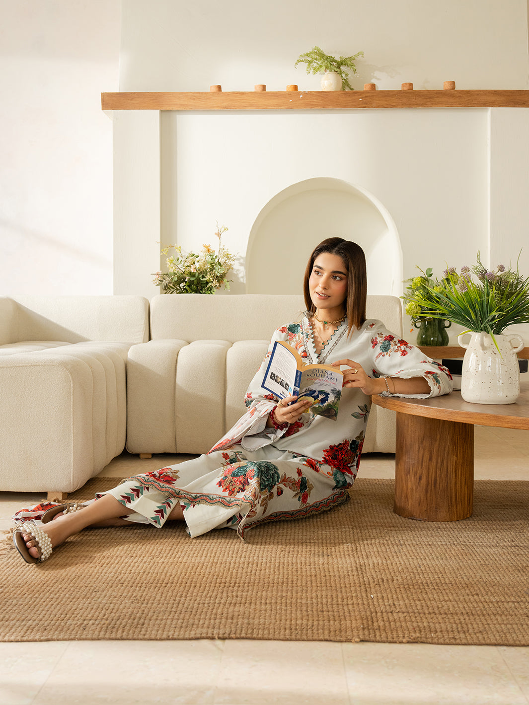 A flowing chiffon dupatta, painted with cascading florals, completes the ensemble with effortless sophistication. Perfect for cozy get-togethers or evenings that call for quiet glamour, Nysa is a statement piece — where timeless beauty meets radiant charm.