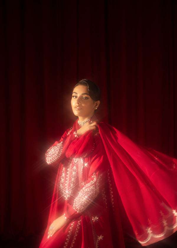 Step into luxury and grandeur with the Pink Mavis Kalidar Dress, crafted from Premium Rayon Silk. This opulent design features a fitted silhouette, an exquisitely scalloped hemline, and meticulous hand embellishments with radiant red and silver crystals. The intricate dabka detailing adds an element of regal elegance, making this piece a true masterpiece. Paired with a delicately embroidered chiffon dupatta and tailored cigarette pants, this ensemble is perfect for various occasions.