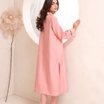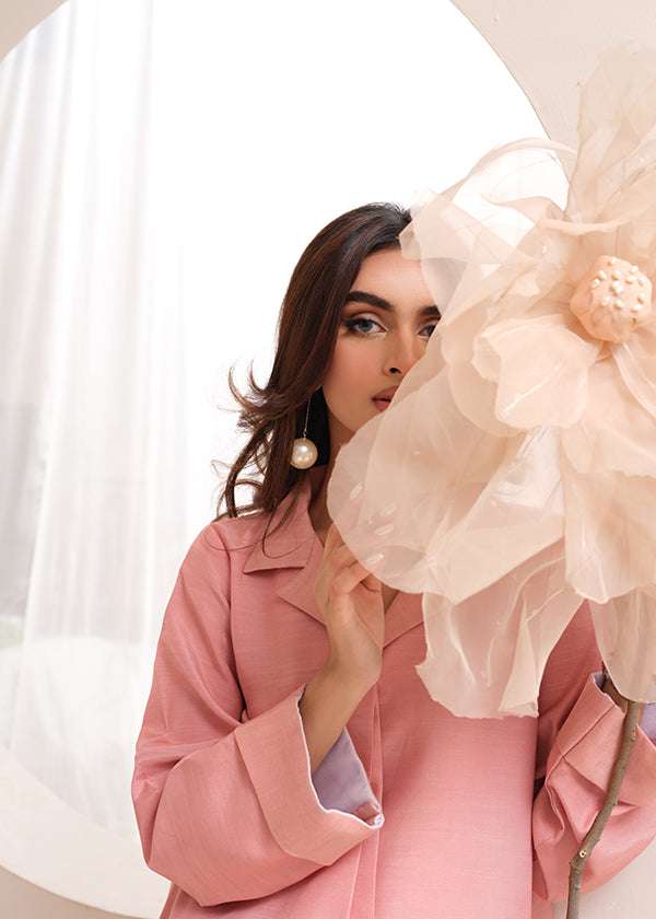 Embrace soft sophistication with this exquisite blush pink raw silk dress. The minimalist silhouette, clean lines, and understated elegance make it a perfect choice for effortless chic styling.