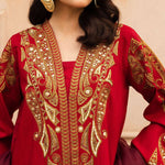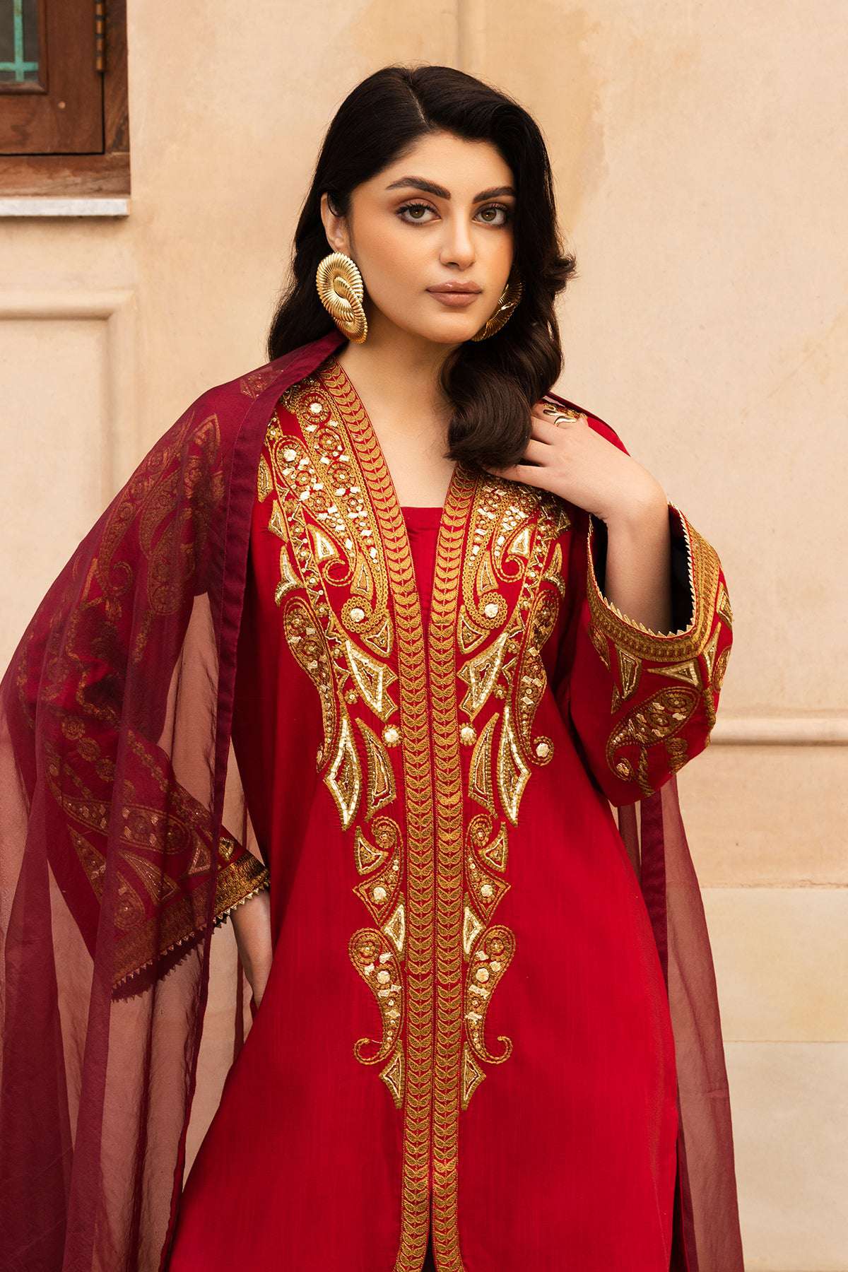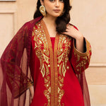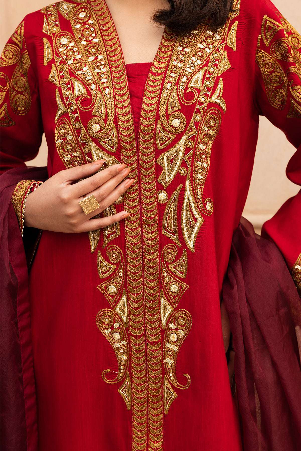 Aabroo is a luxurious Pakistani party wear dress, crafted from deep garnet raw silk with intricate tilla embroidery, gota, dori, sequins, and cut daana work. The farshi shalwar with gota detailing and sheer organza dupatta complete this elegant look, making it a perfect wedding party wear dress for women.