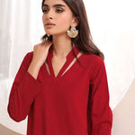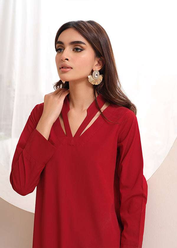 A deep crimson ensemble inspired by the richness of rubies, exuding effortless sophistication. This sleek silhouette is adorned with a refined V-neck and minimalist stitching, offering a perfect harmony of simplicity and opulence. Designed for those who appreciate understated luxury, this outfit is a wardrobe essential.