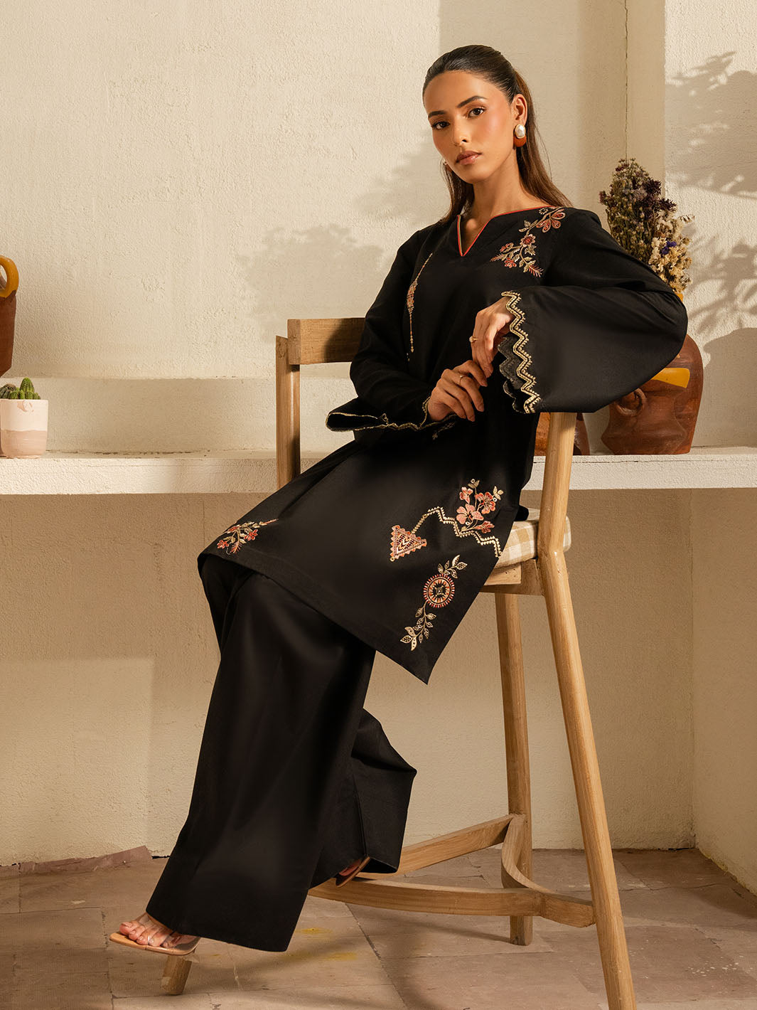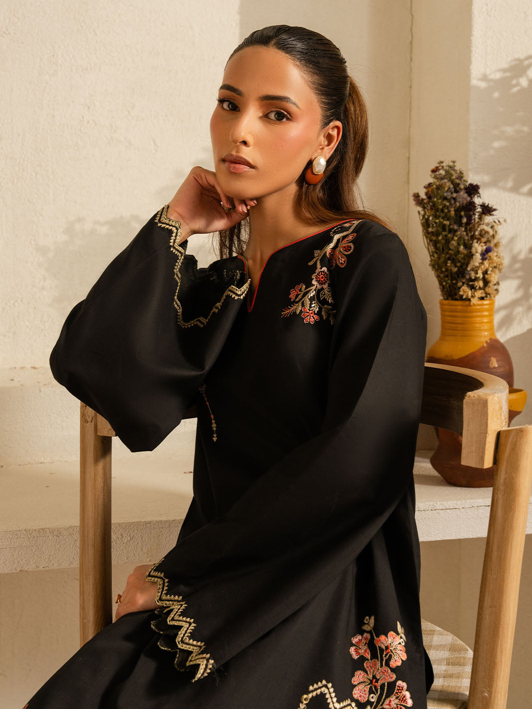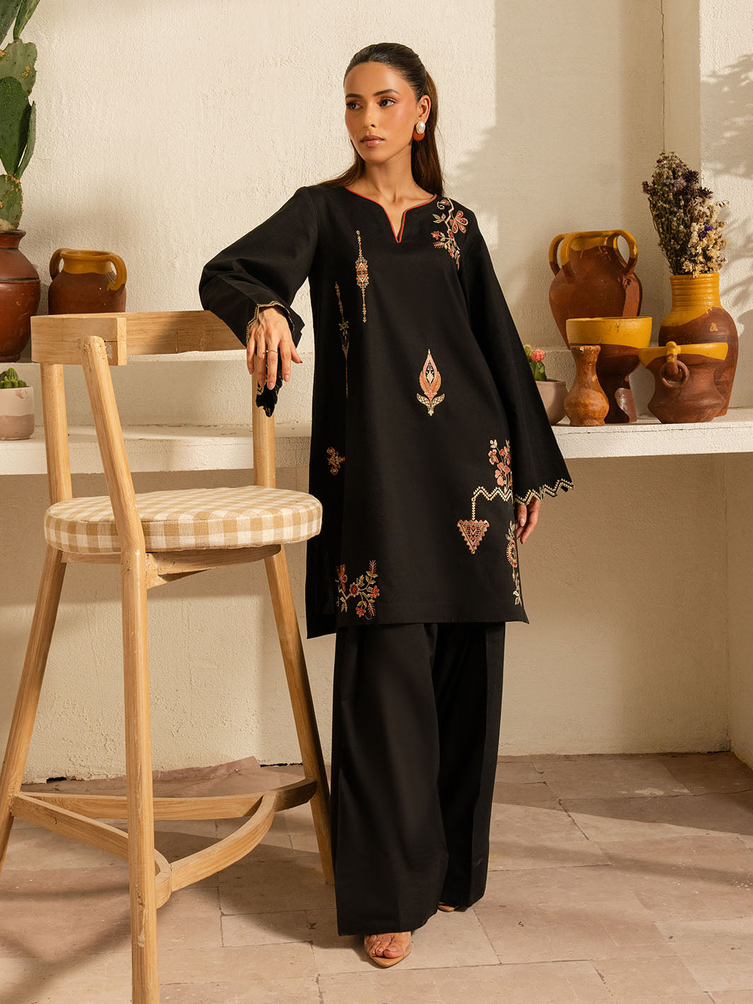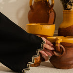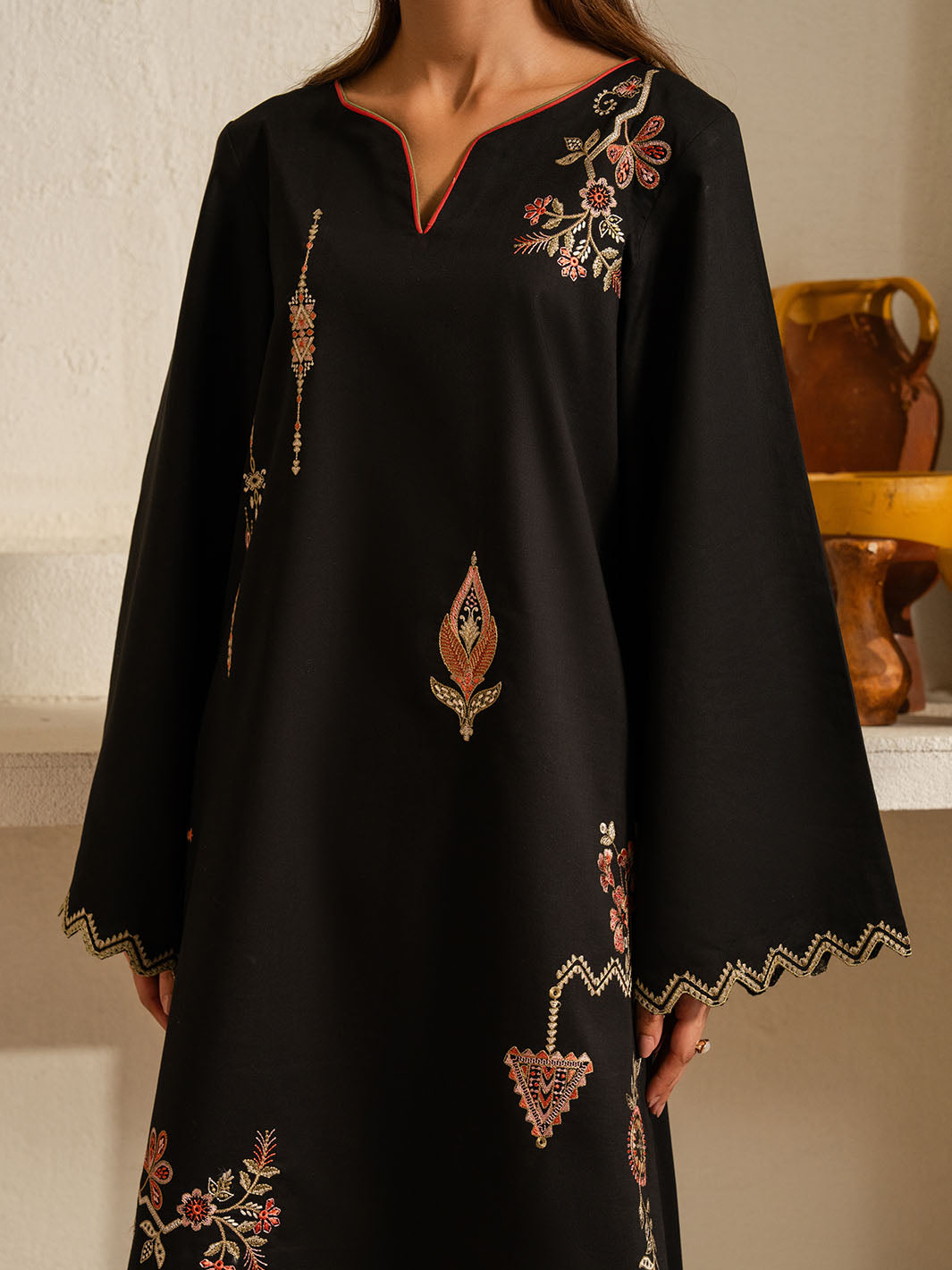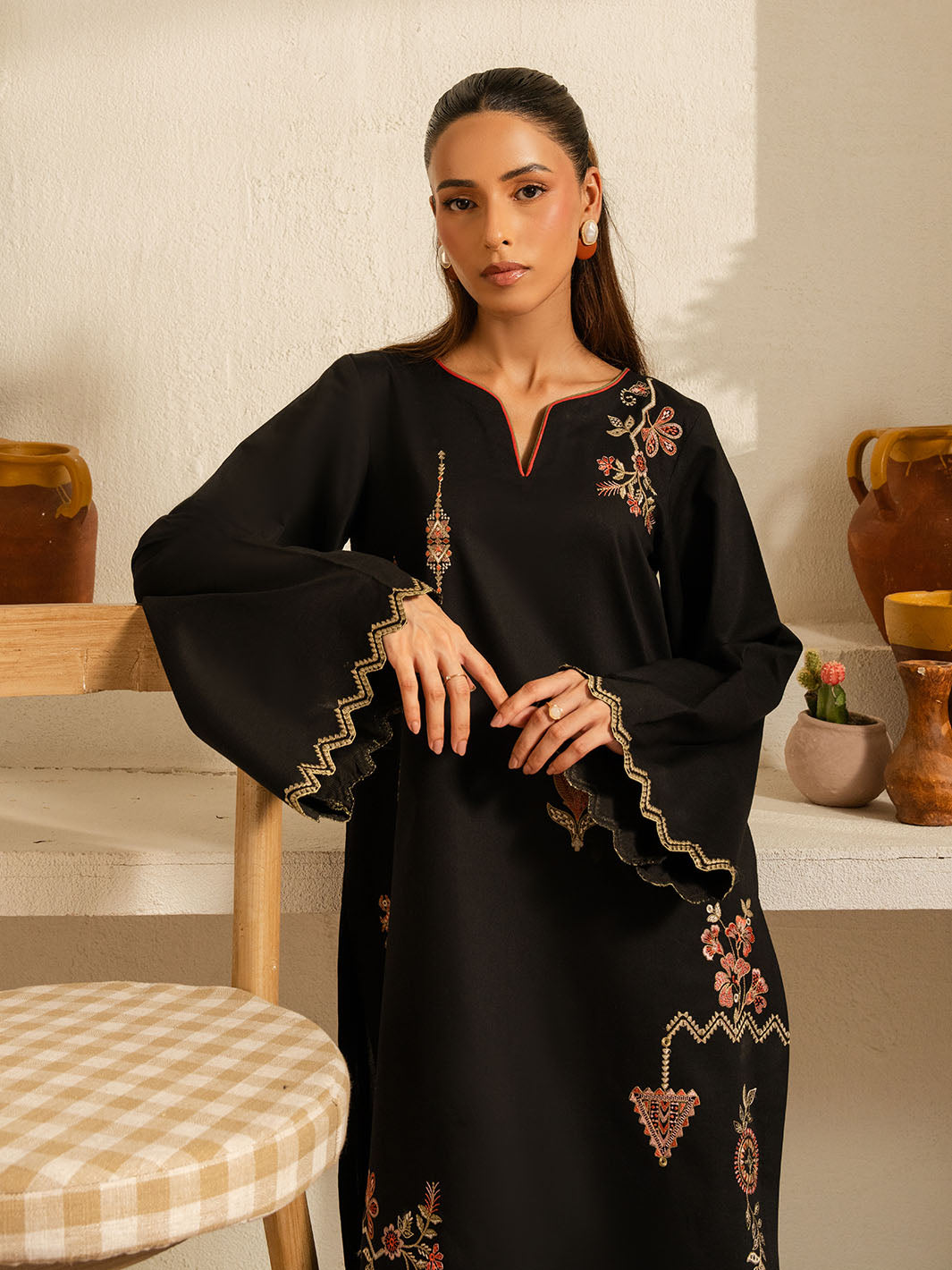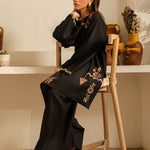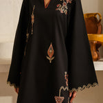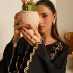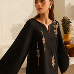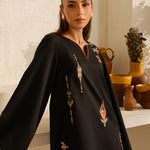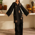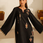 Inspired by the mystic’s song, this deep black cotton set is a quiet symphony of presence and poetry. Intricate embroidery dances along the sleeves and hem, echoing the whirls of a reed flute—gentle, evocative, eternal. Paired with a matching shalwar, this ensemble flows in rhythm and grace.