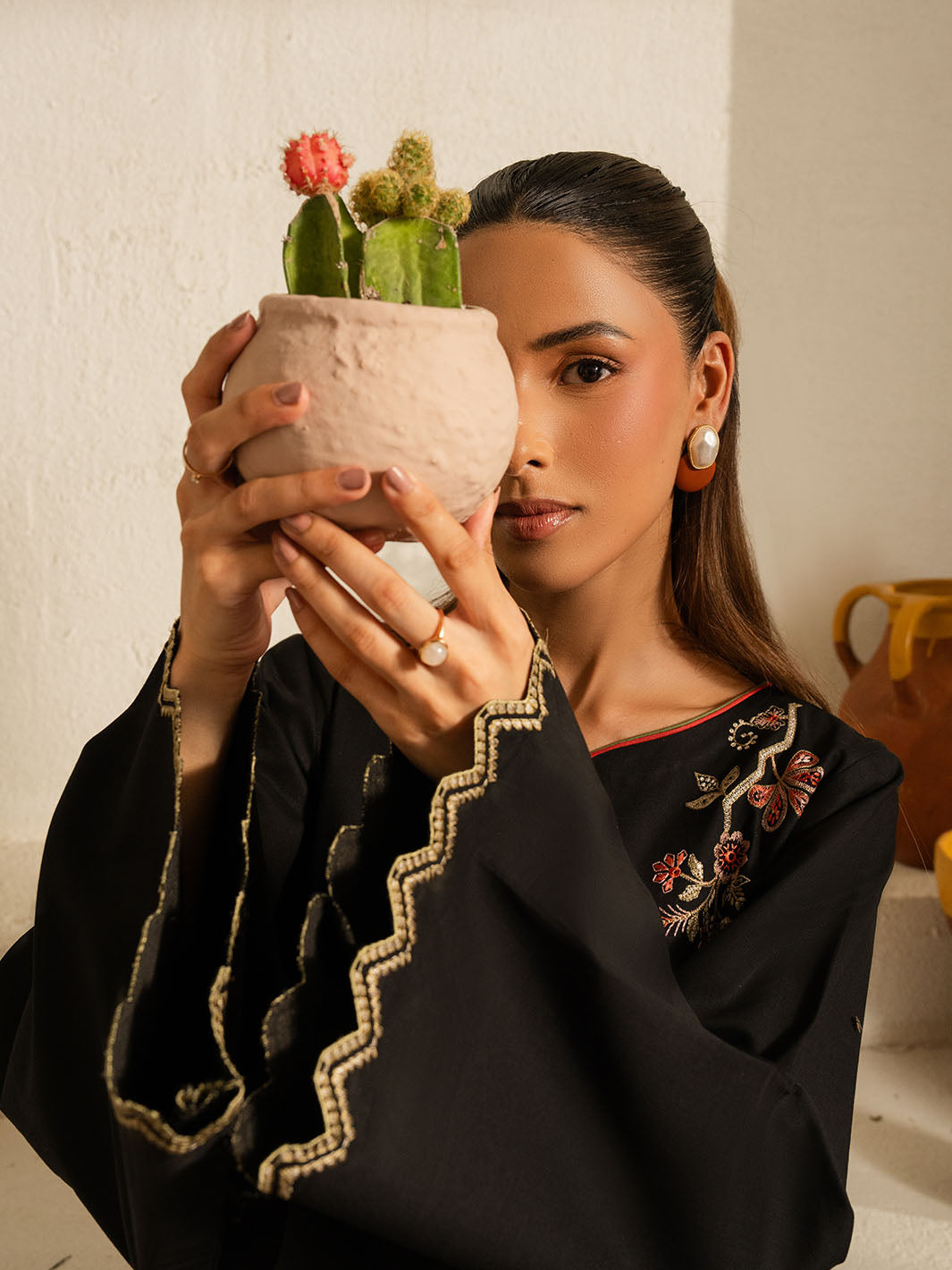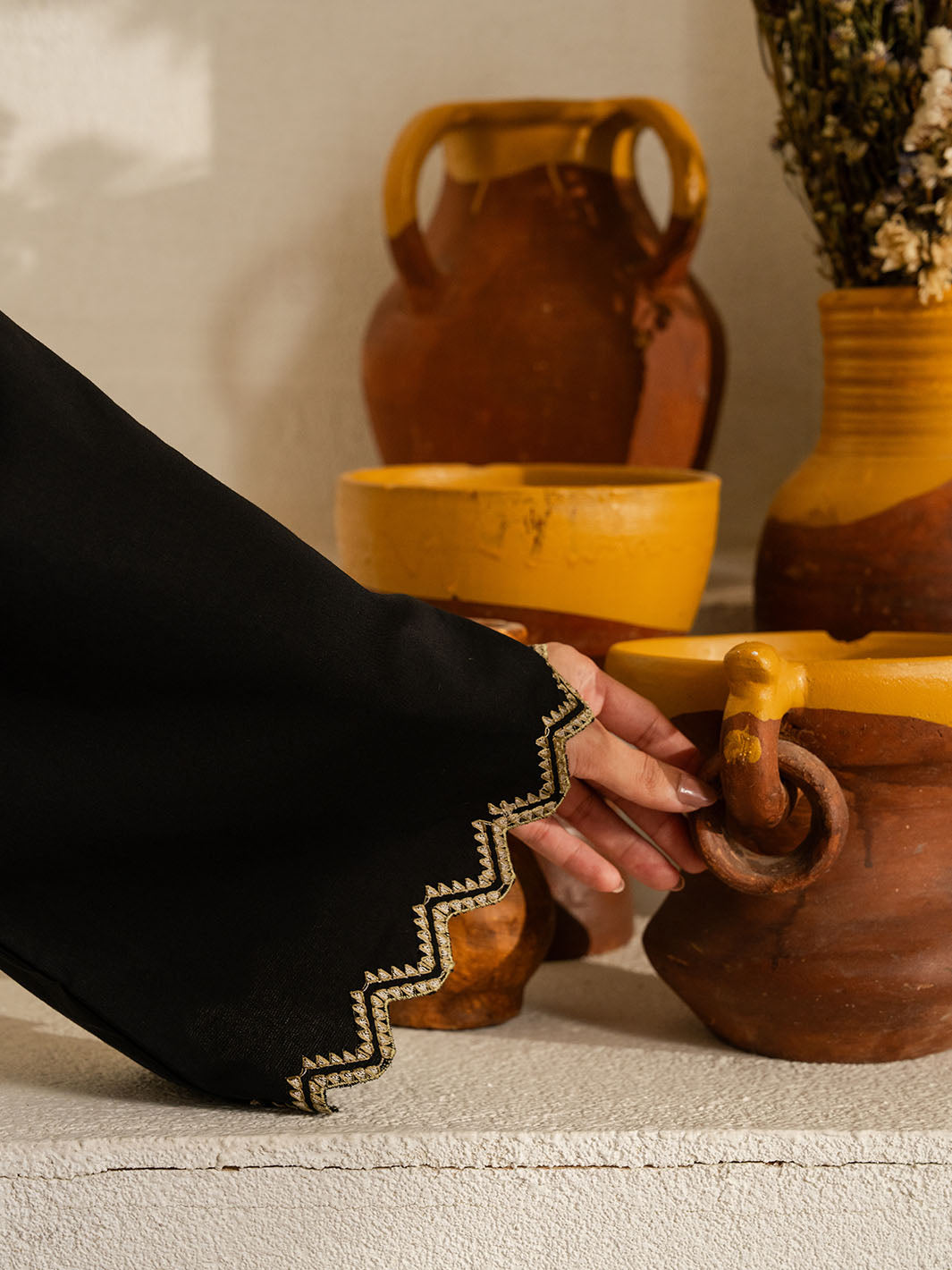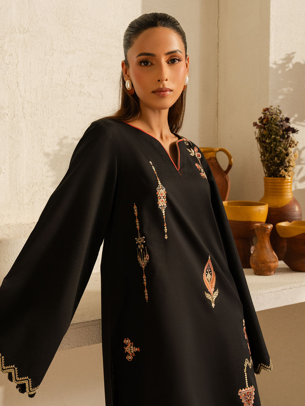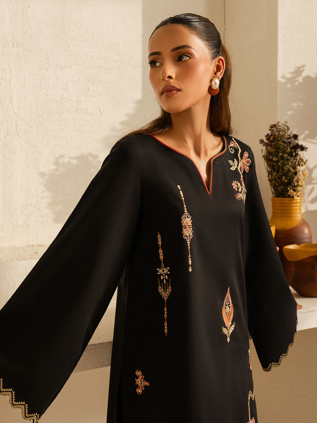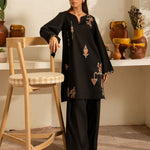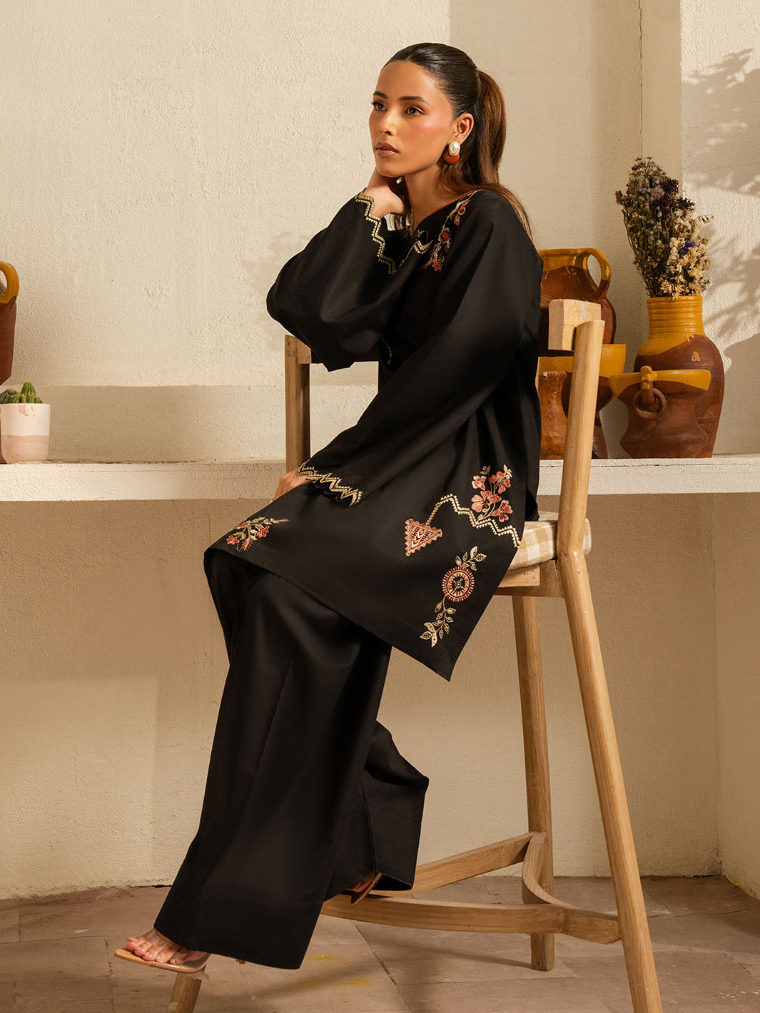 Inspired by the mystic’s song, this deep black cotton set is a quiet symphony of presence and poetry. Intricate embroidery dances along the sleeves and hem, echoing the whirls of a reed flute—gentle, evocative, eternal. Paired with a matching shalwar, this ensemble flows in rhythm and grace.