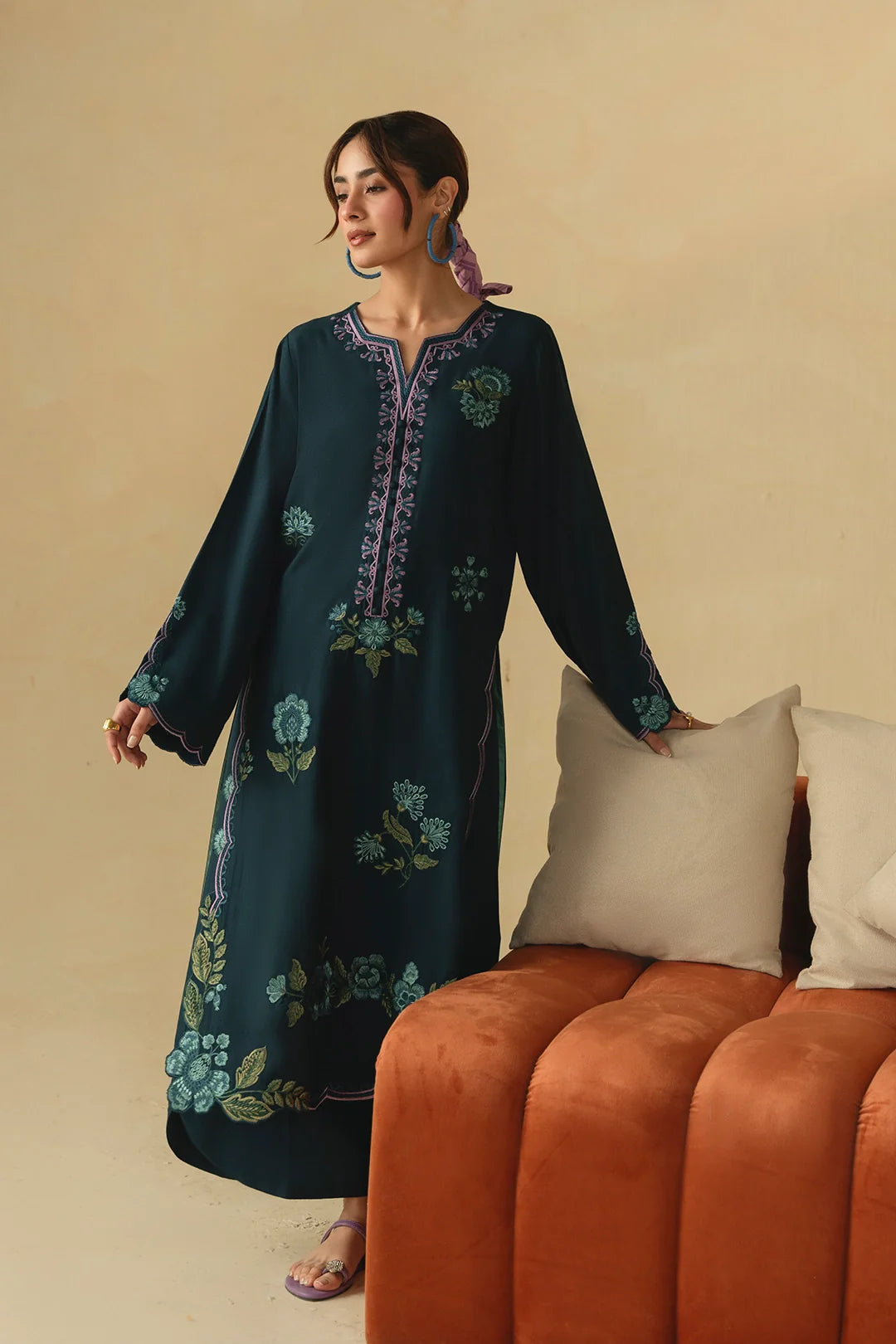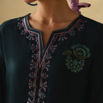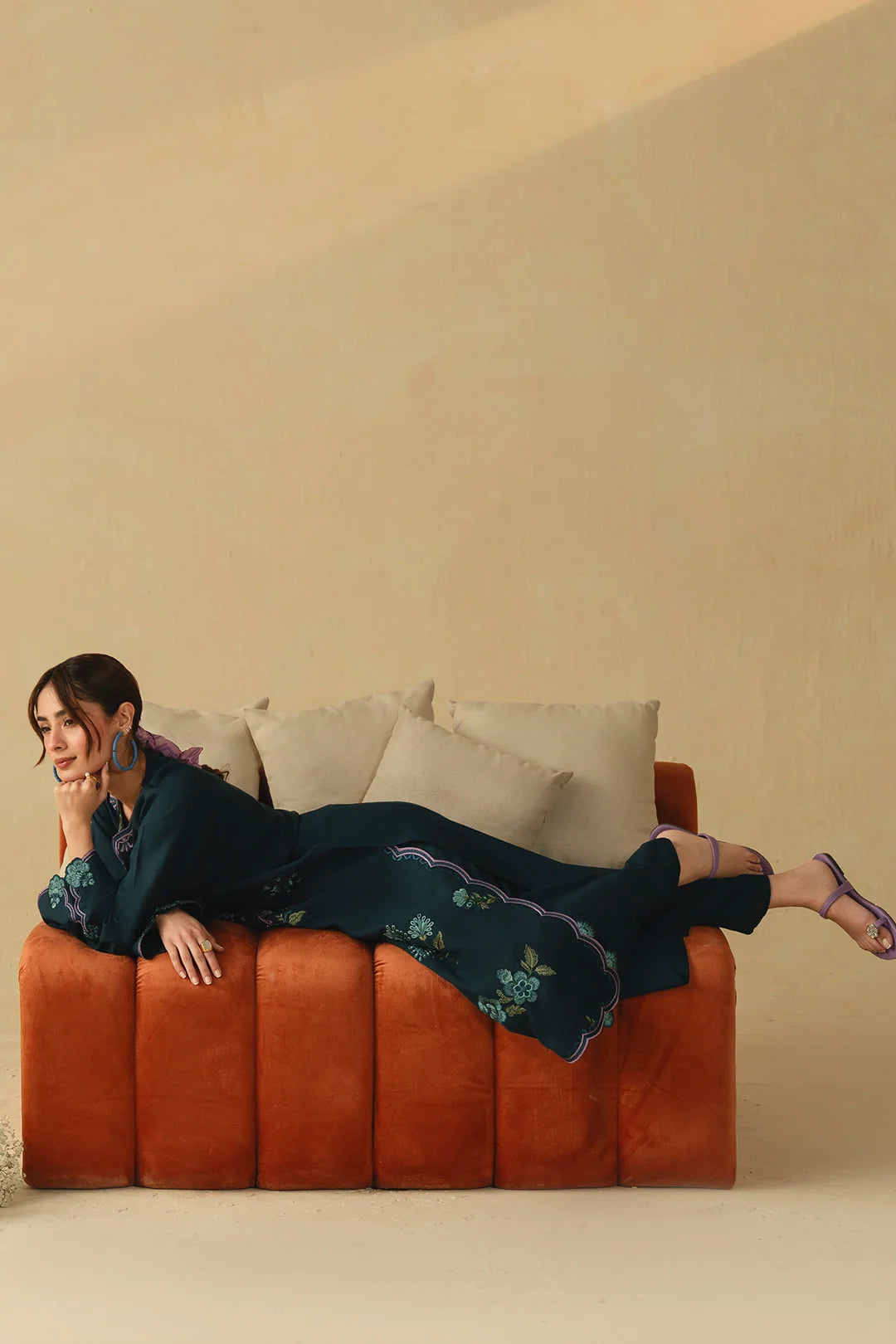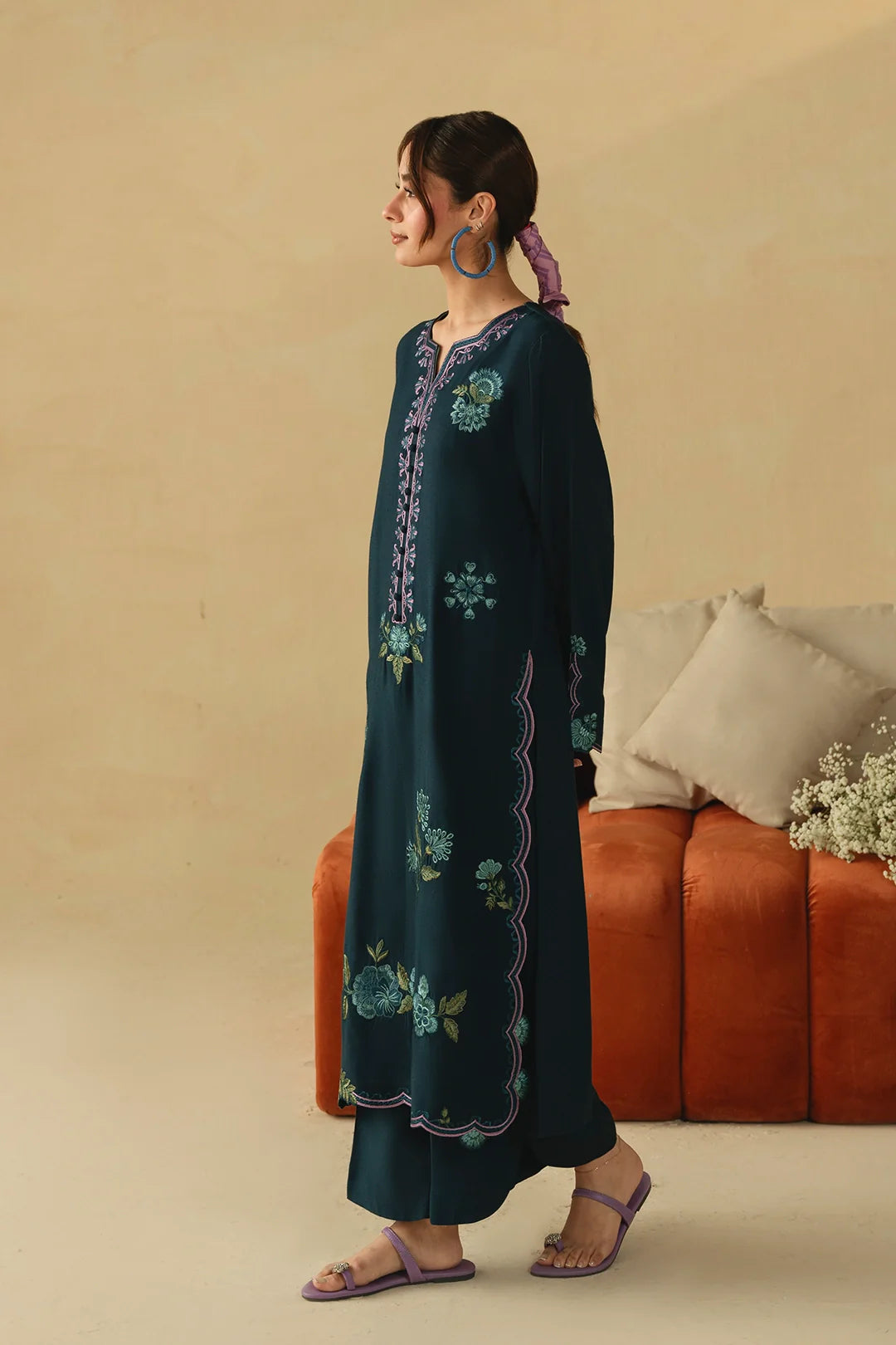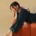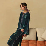 • A refined two-piece ensemble featuring a long embroidered shirt paired with wide-leg trousers, beautifully finished with delicate floral scalloping and intricate embroidery details for an elegant and timeless look.