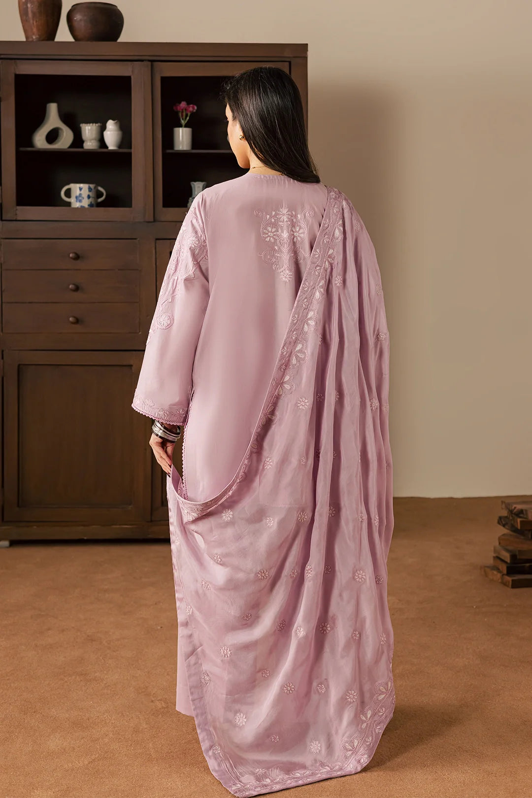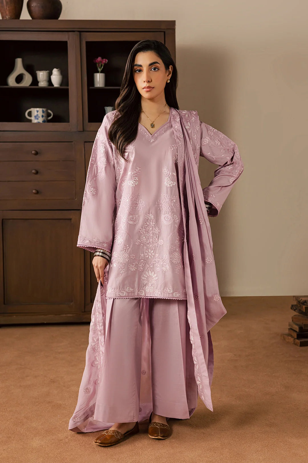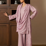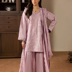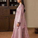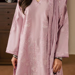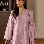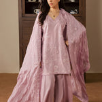 A graceful three-piece lilac ensemble crafted in soft cotton, featuring a short embroidered shirt with delicate embroidery details on the front and a subtle embroidered motif at the back. Paired with wide trousers and a silk embroidered dupatta, this outfit offers a perfect balance of elegance and contemporary charm.