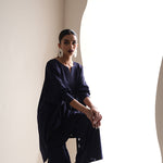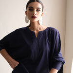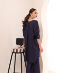 Make a striking statement in this deep sapphire blue ensemble, crafted for those who love effortless elegance. The relaxed, oversized silhouette features meticulous stitching along the neckline, creating a refined V-cut detail. Designed for both comfort and sophistication, the flowing crepe shirt pairs seamlessly with wide-leg pants, ensuring a graceful drape and modern appeal. This luxury blue outfit is perfect for formal occasions, evening wear, or elevated casual looks.