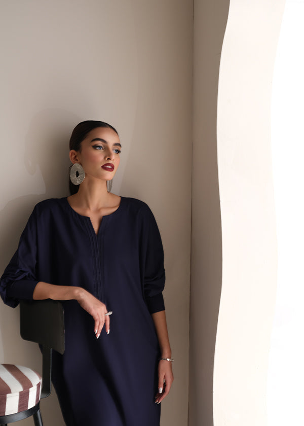 Step into refined luxury with this timeless sapphire blue crepe outfit, designed to turn heads with its understated charm.