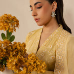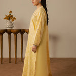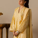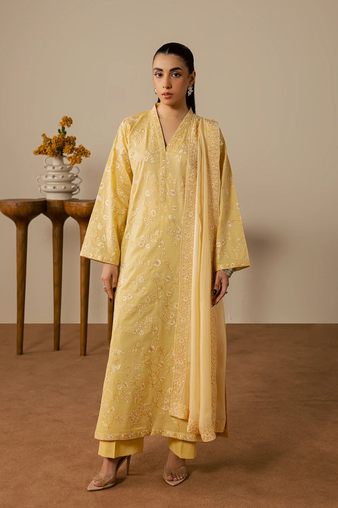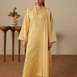 A beautiful pastel yellow three-piece ensemble crafted in soft cotton, featuring a fully embroidered front long shirt with subtle embroidery detailing at the back hem. Paired with matching trousers and a silk embroidered dupatta, this outfit is perfect for a bright, graceful, and festive look.