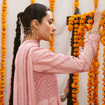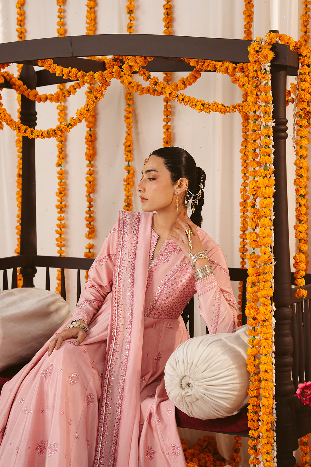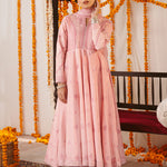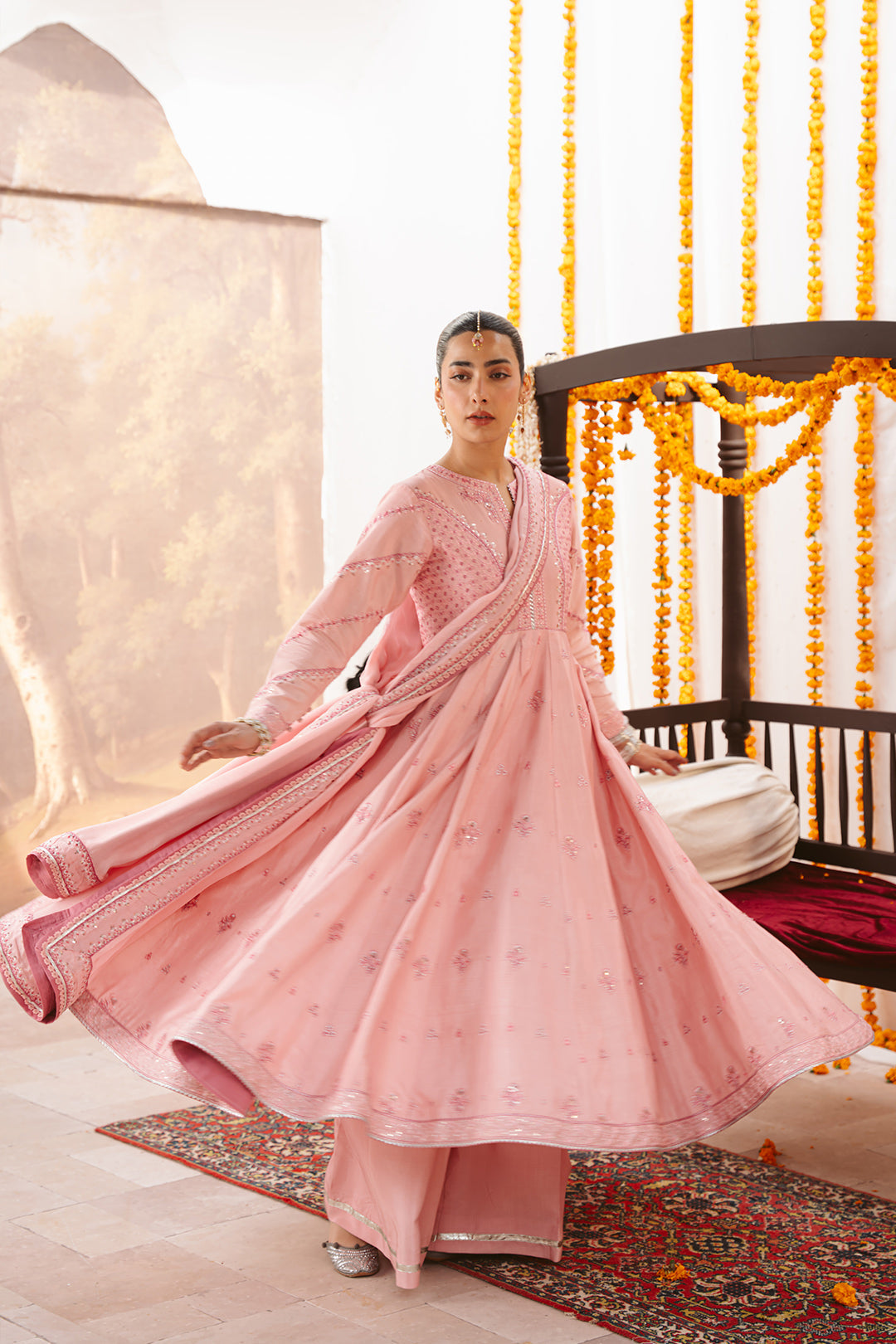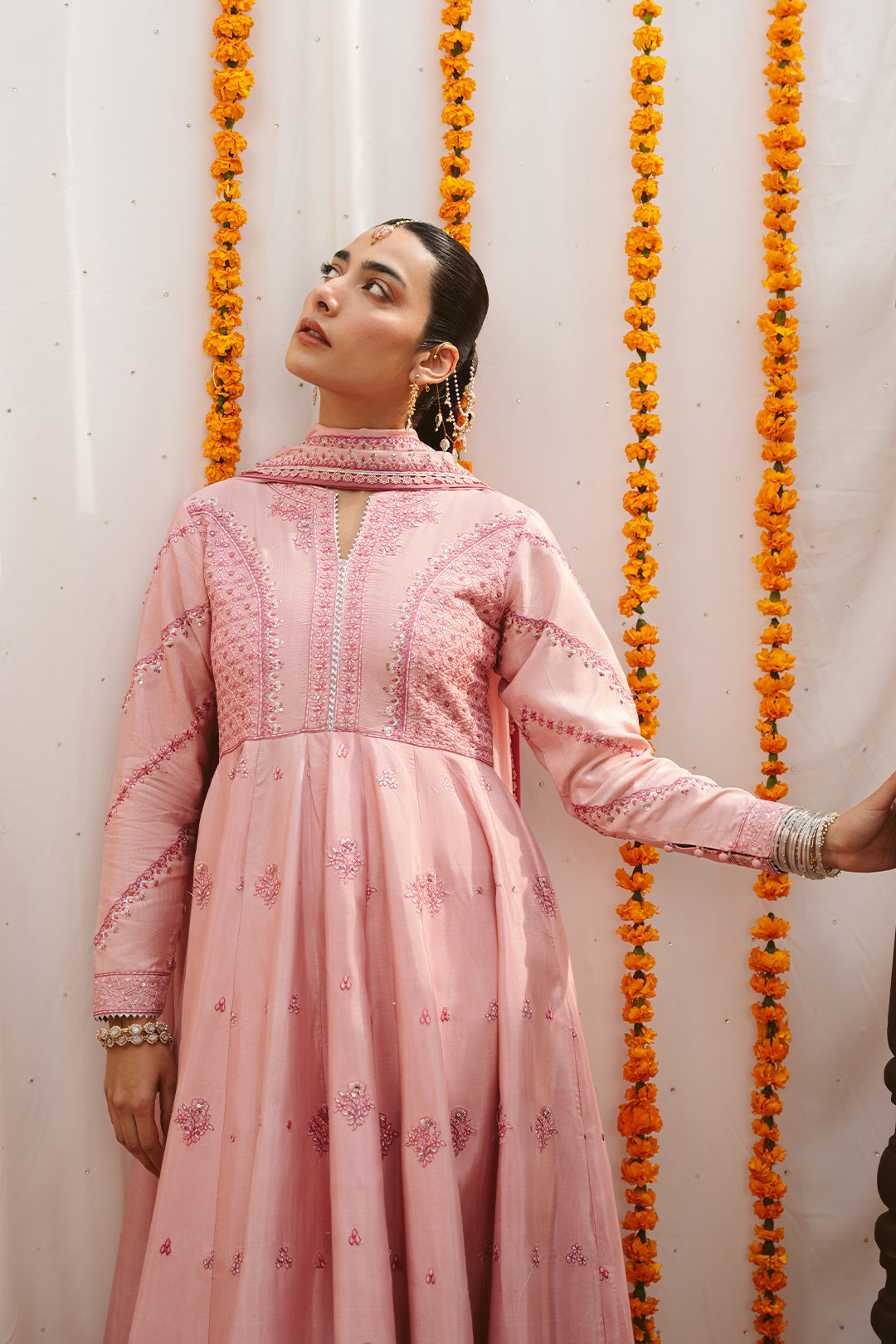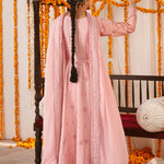 The perfect pastel pink pishwas is crafted as a three-piece ensemble, featuring delicate embroidery on both the front and back with intricate gota detailing. It is paired with a flowing long flared bottom and completed with an embroidered silk dupatta, offering graceful movement and timeless charm.