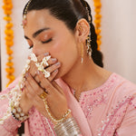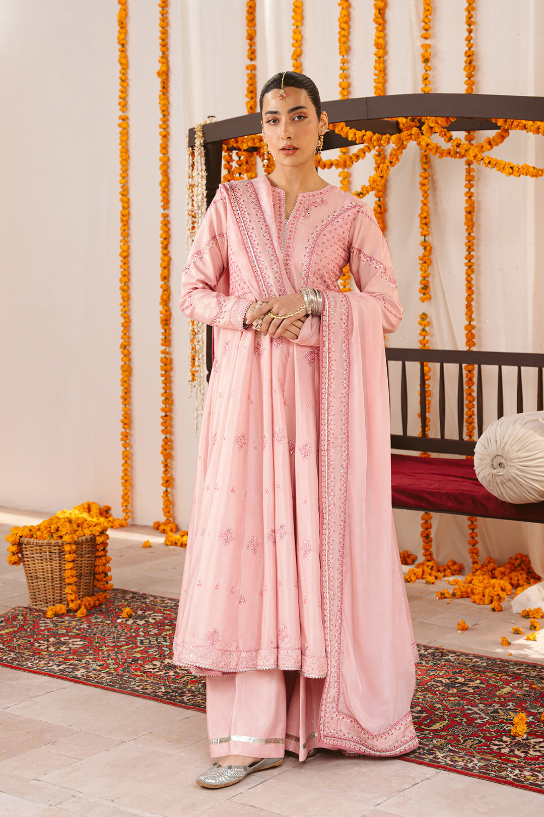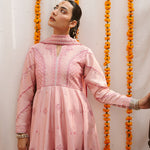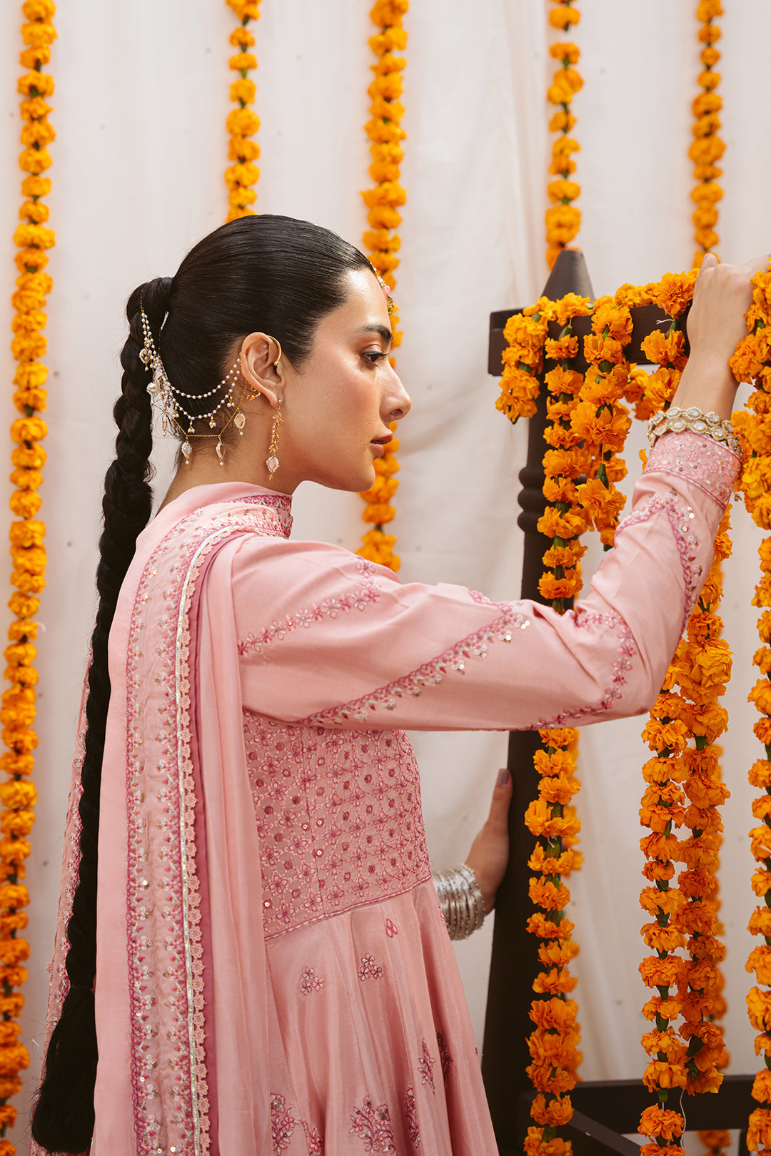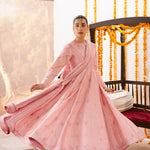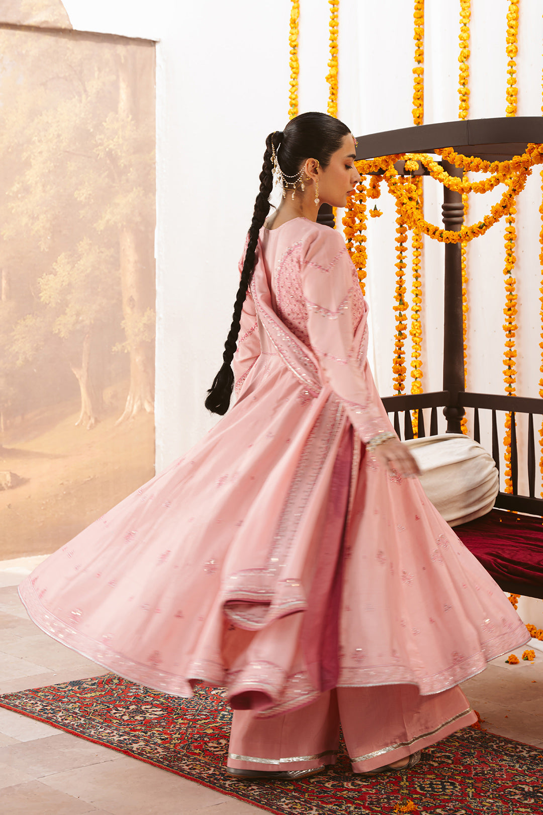 The perfect pastel pink pishwas is crafted as a three-piece ensemble, featuring delicate embroidery on both the front and back with intricate gota detailing. It is paired with a flowing long flared bottom and completed with an embroidered silk dupatta, offering graceful movement and timeless charm.