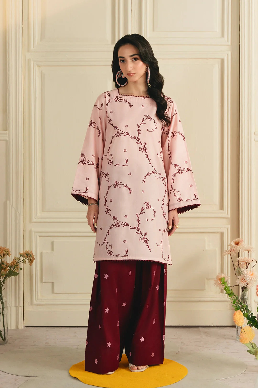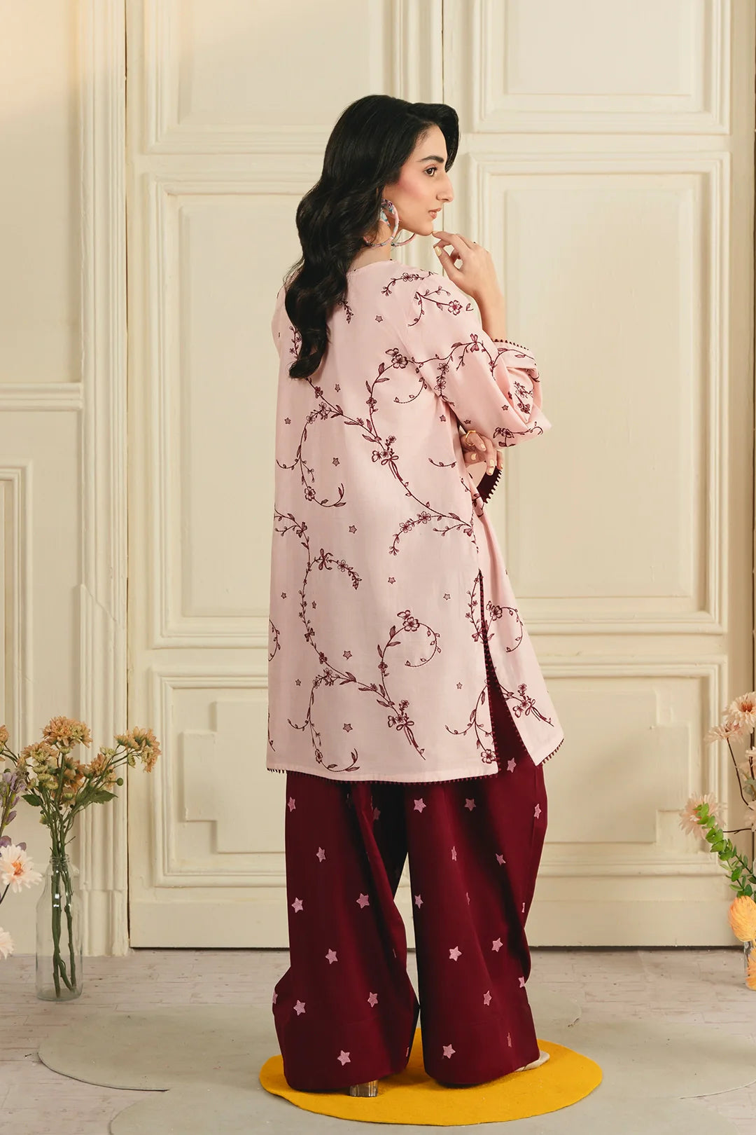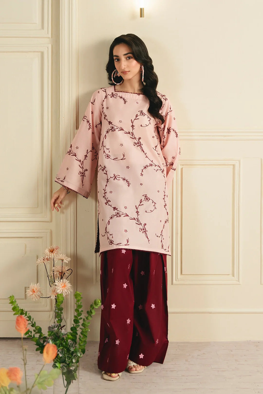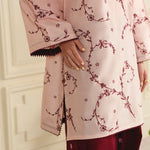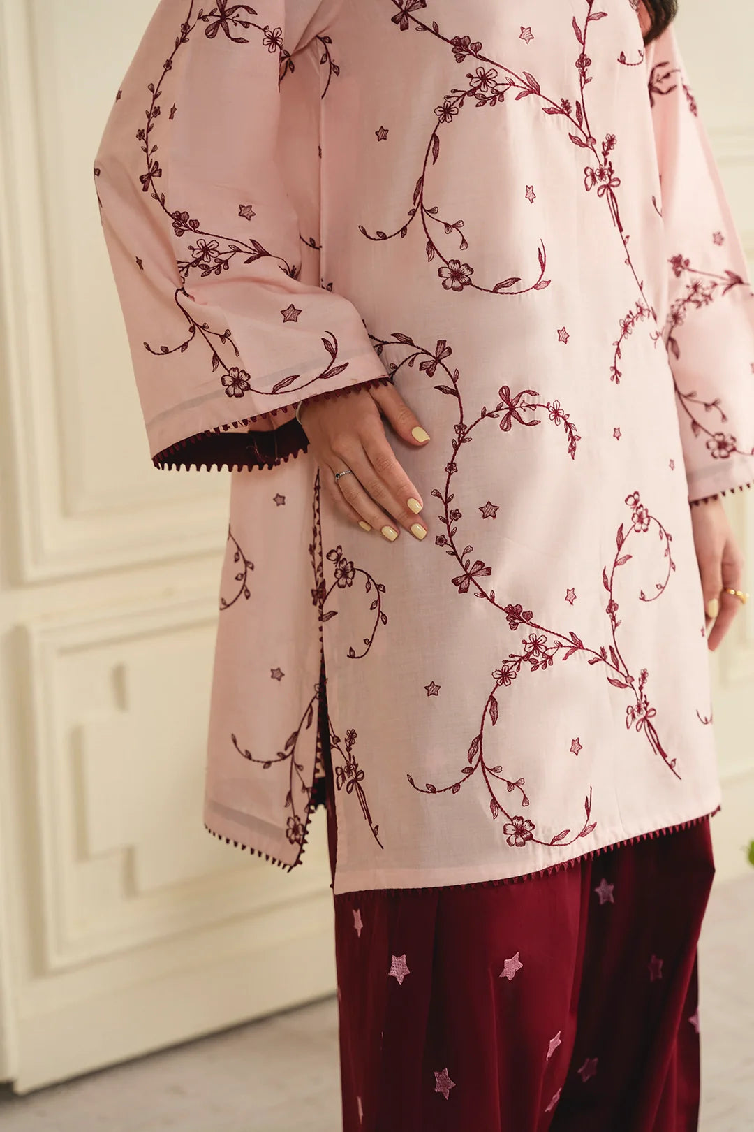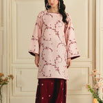 • A graceful two-piece ensemble featuring an embroidered shirt with all-over embroidery and a modern square neckline. It is paired with an embroidered farshi shalwar, adorned with delicate star-pattern embroidery for a refined and elegant finish.