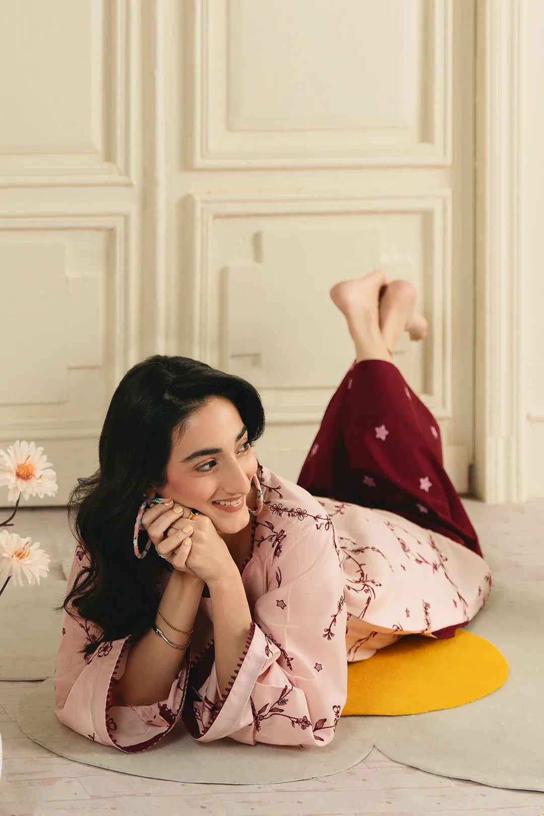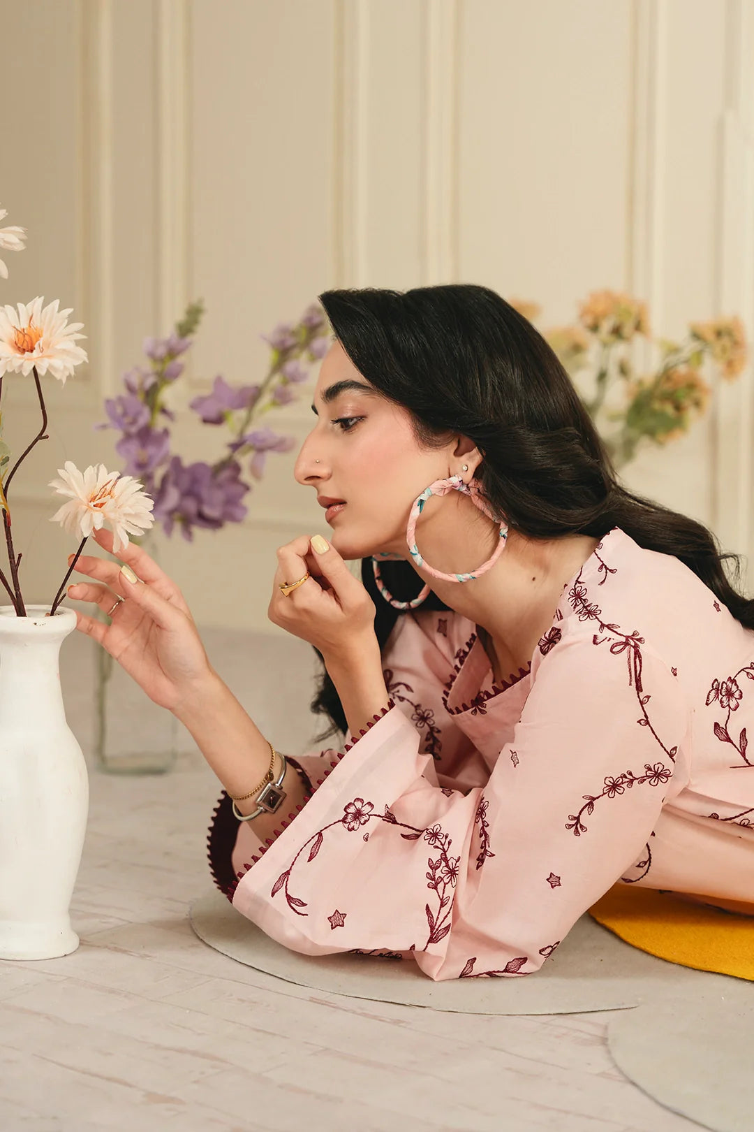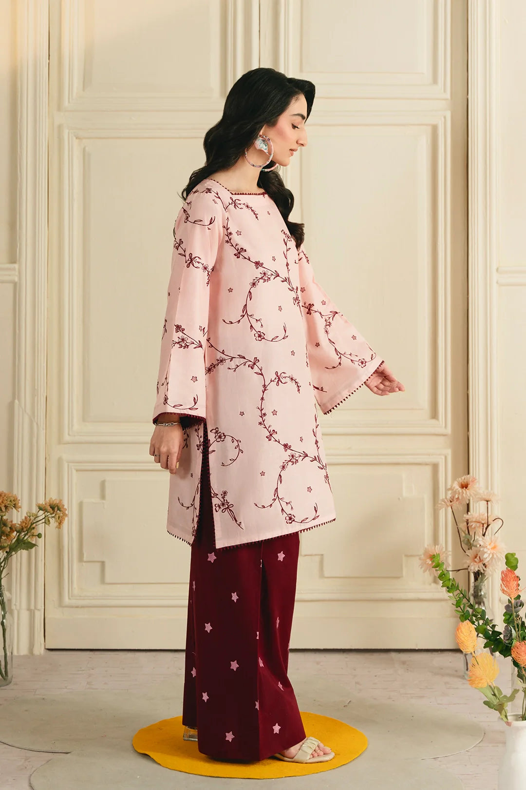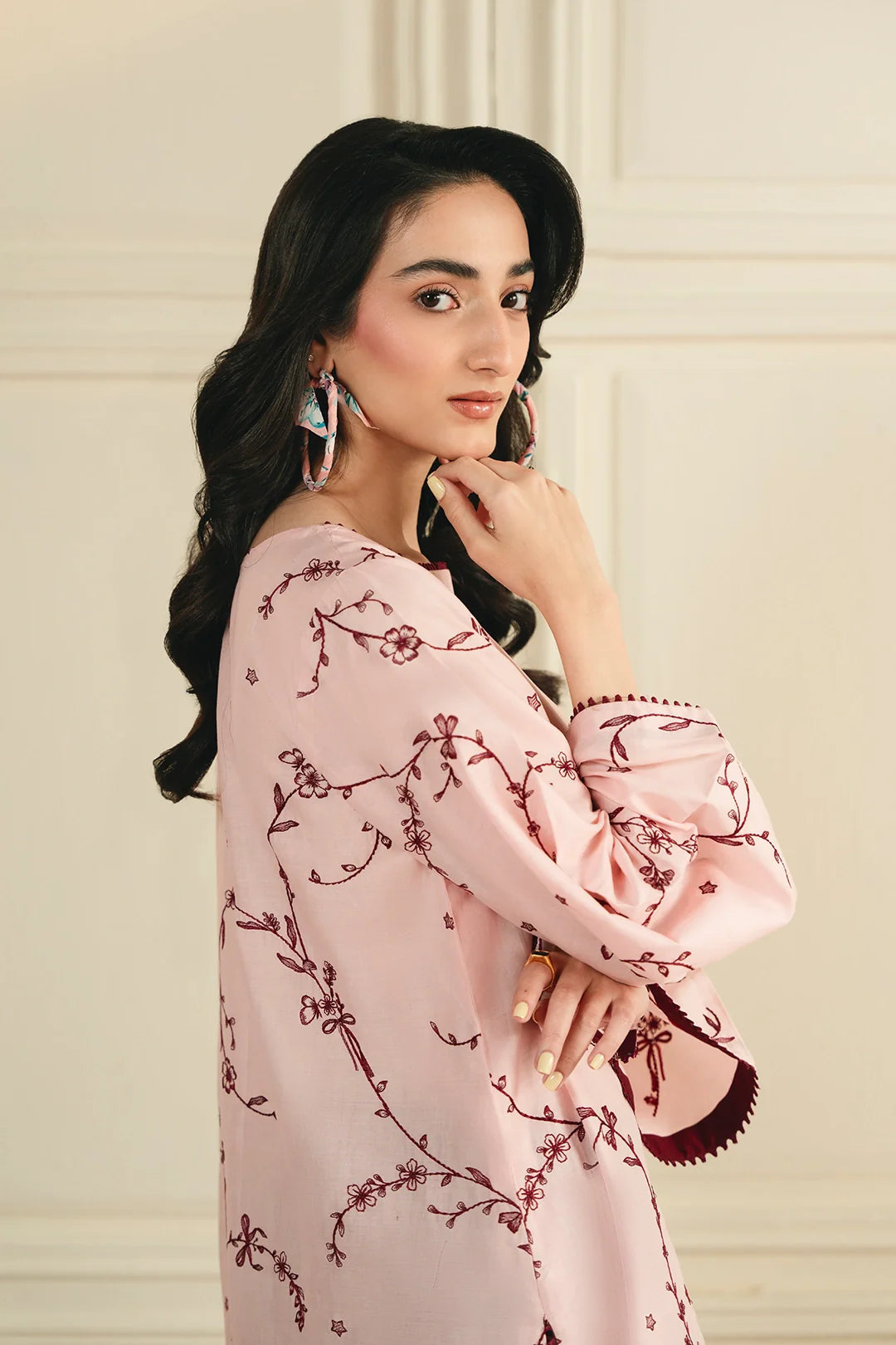 • A graceful two-piece ensemble featuring an embroidered shirt with all-over embroidery and a modern square neckline. It is paired with an embroidered farshi shalwar, adorned with delicate star-pattern embroidery for a refined and elegant finish.