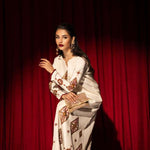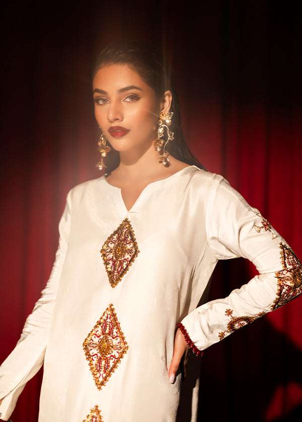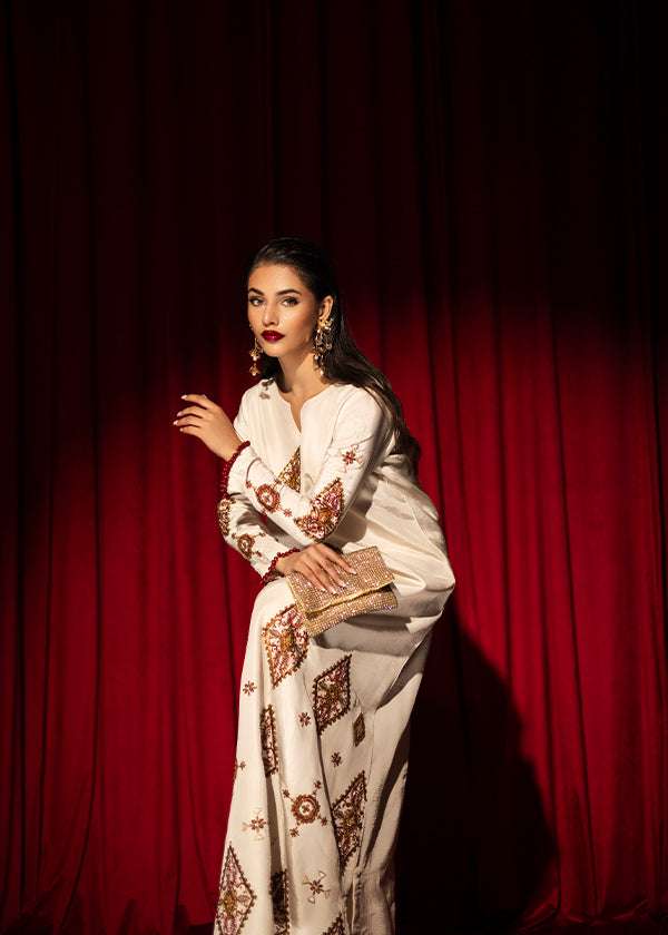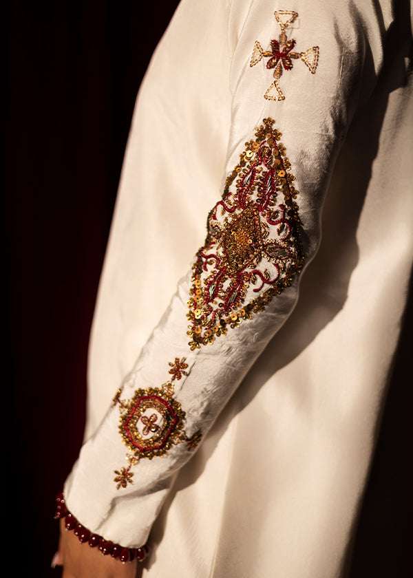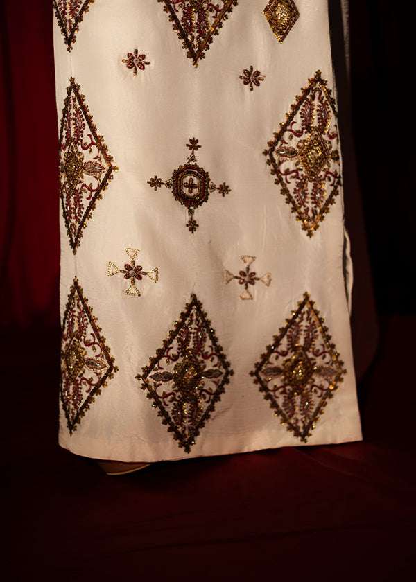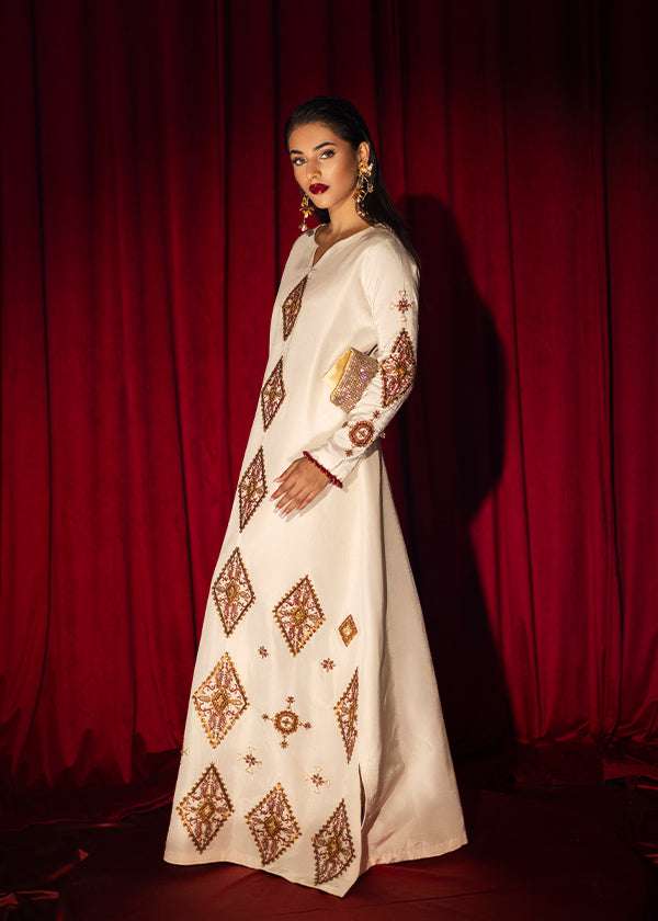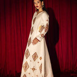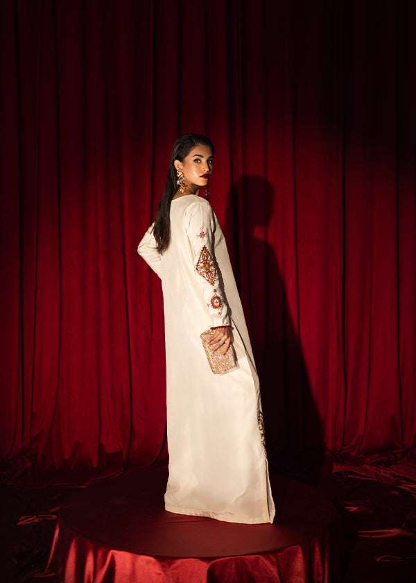 Step into elegance with this regal ivory kaftan, crafted from Premium Rayon Silk and adorned with intricate zardosi, sequins, and delicate beadwork. The symmetrical embellishments add a touch of grandeur, making it the perfect statement piece for any occasion.