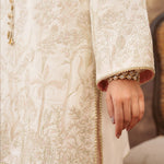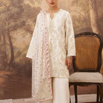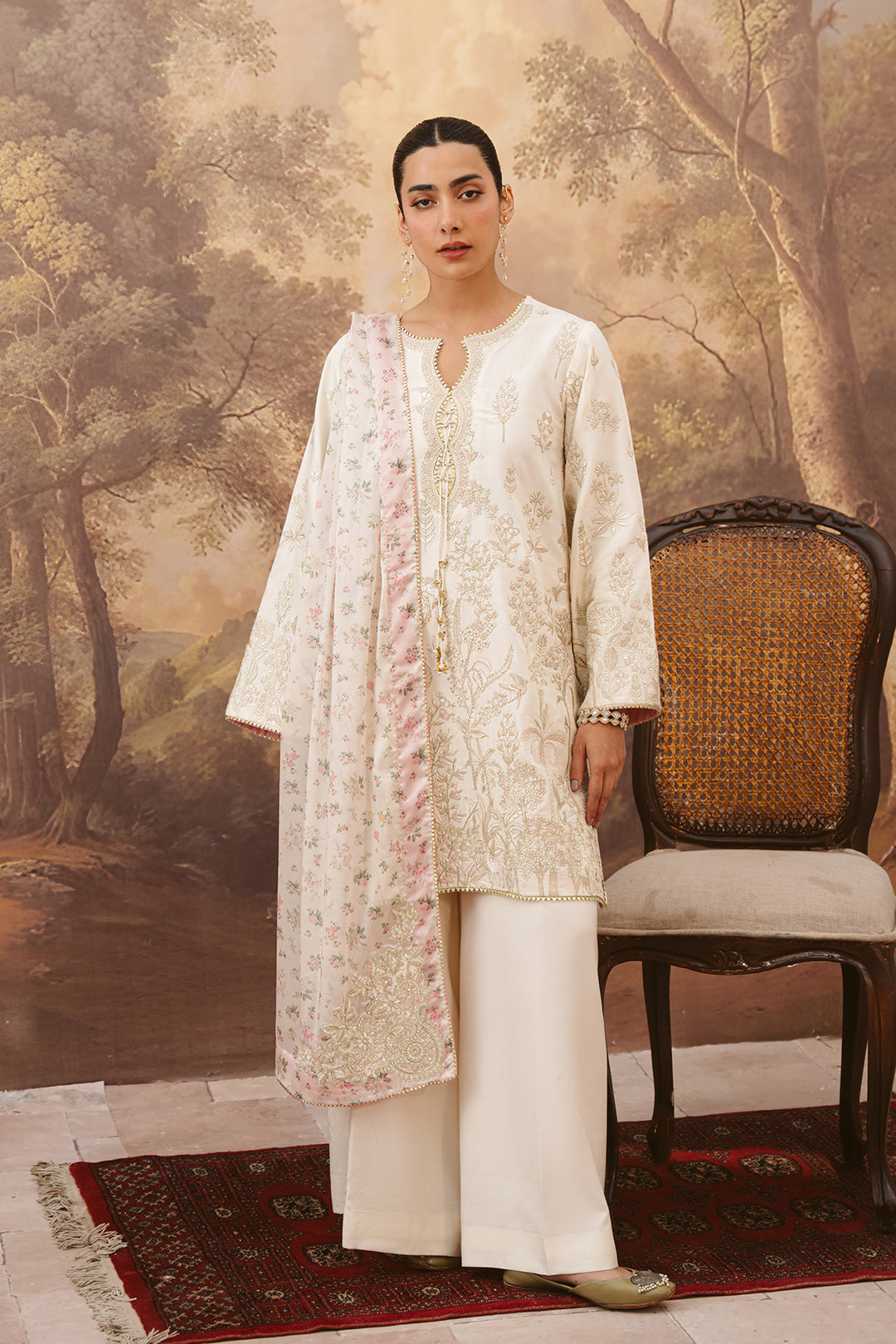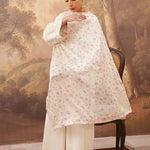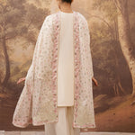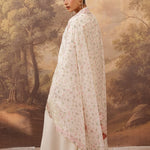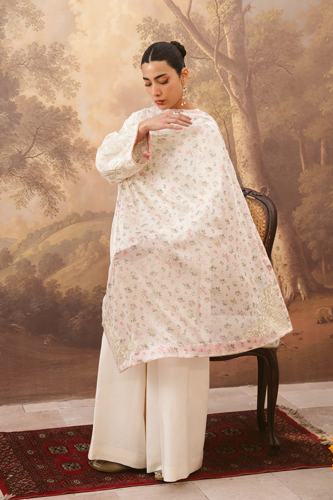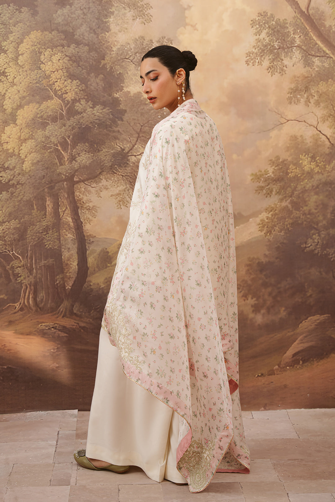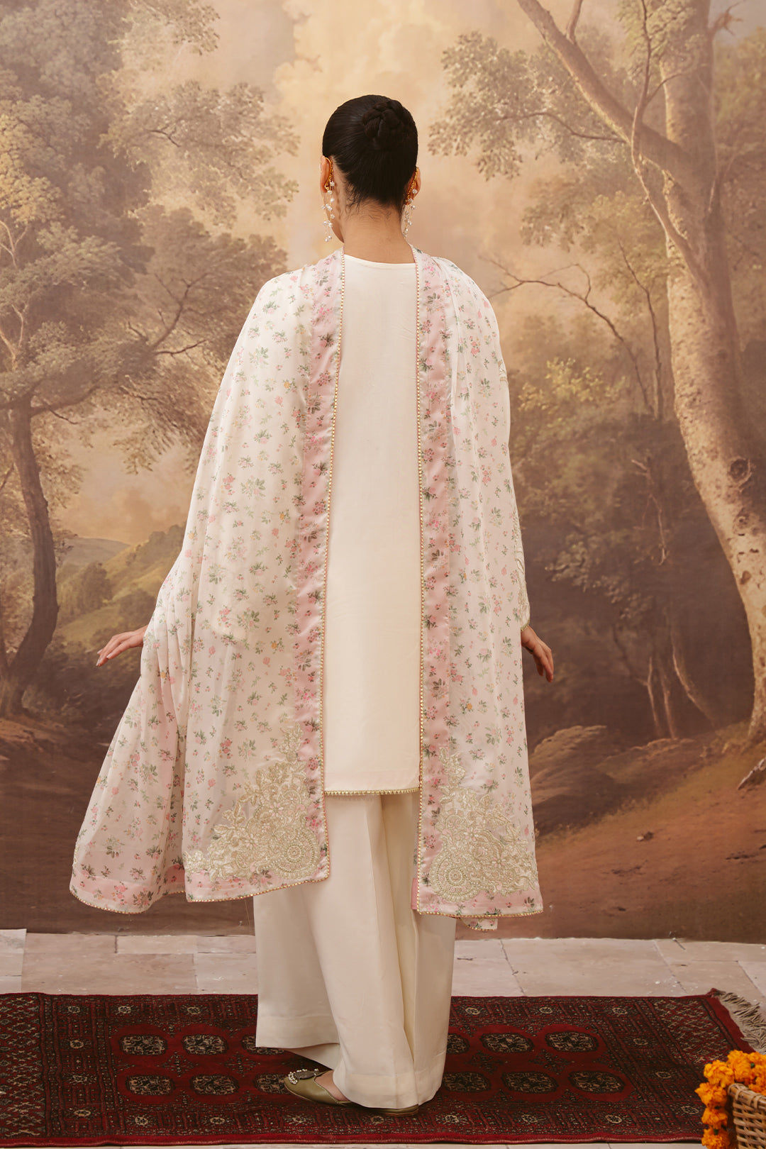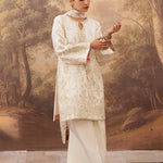 This pearl white elegant three-piece ensemble features a short raw silk shirt, beautifully embroidered and adorned with gota lace and tassel detailing along the neckline. It is paired with wide-leg culottes for a contemporary silhouette and completed with a printed silk dupatta, finished with contrasting facing and intricate corner embroidery for a refined finish.