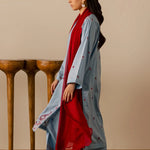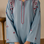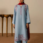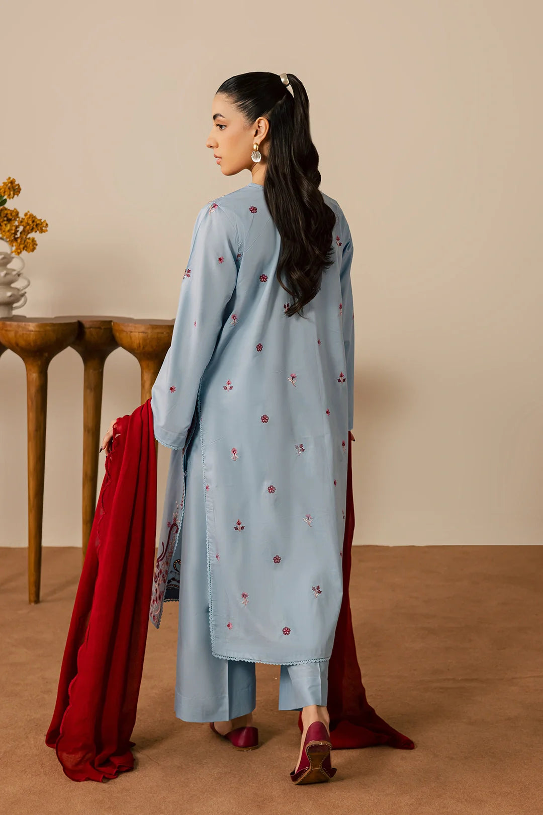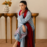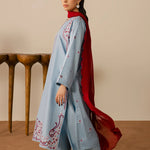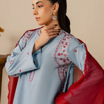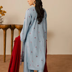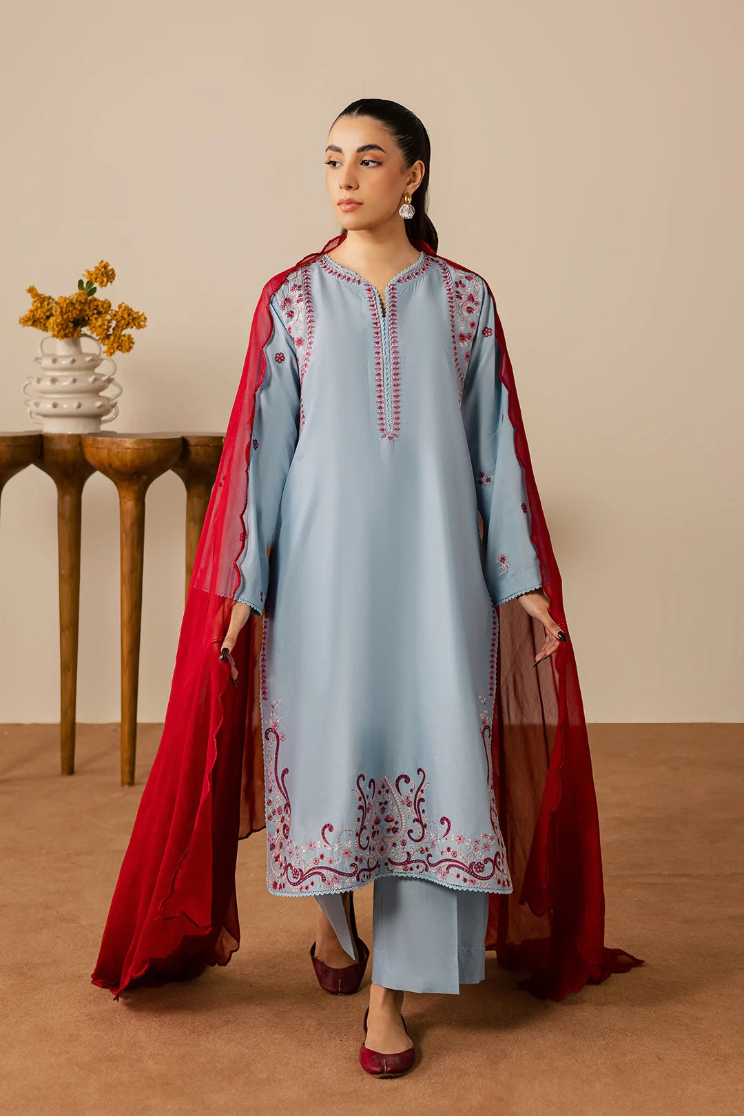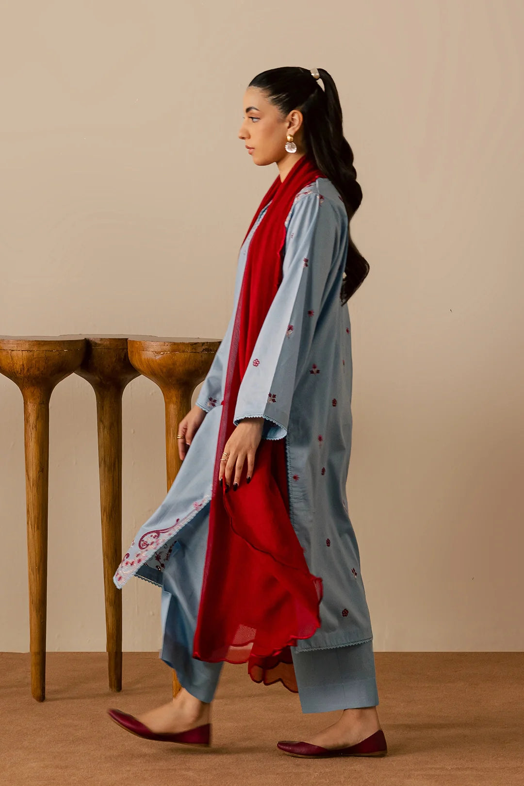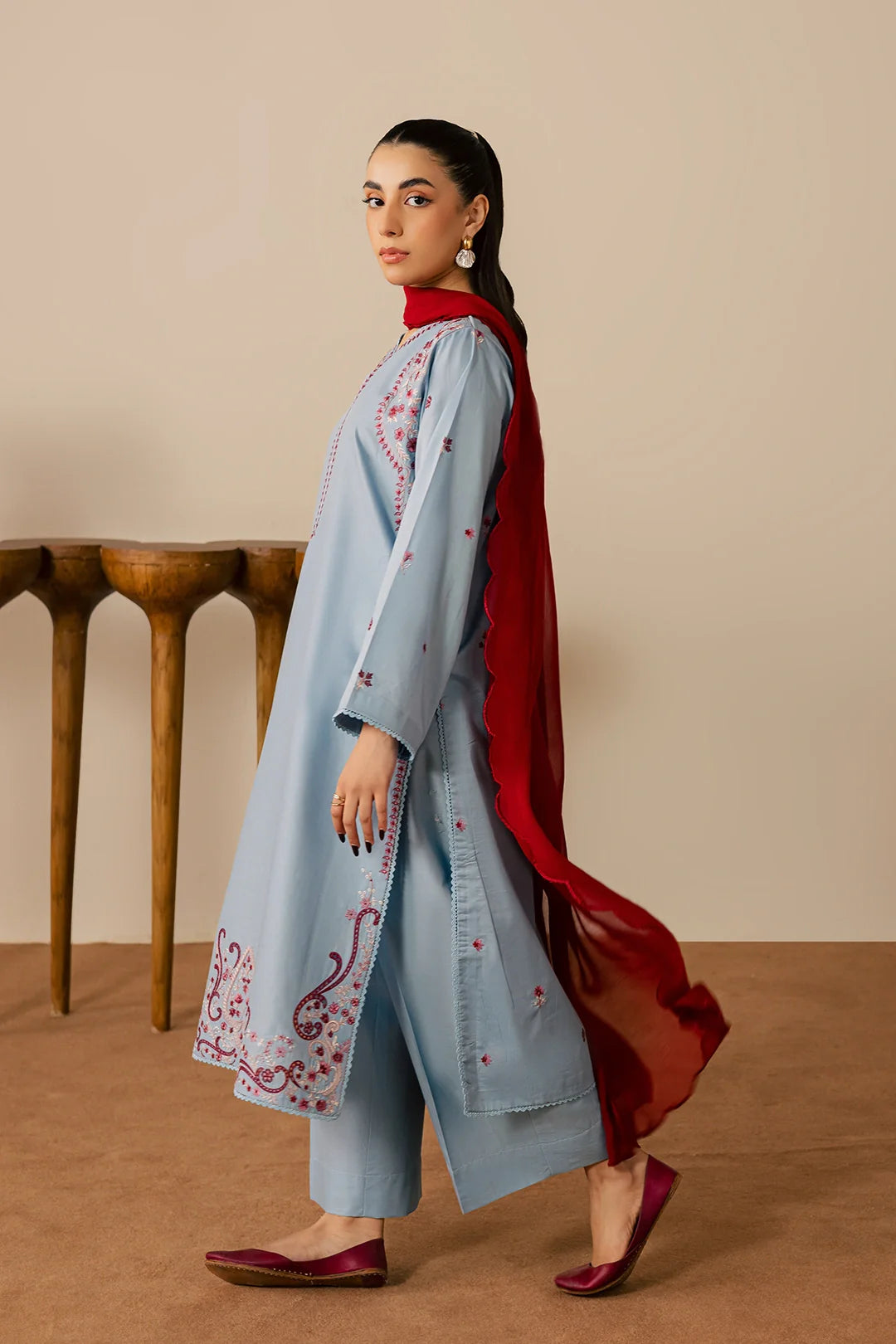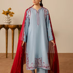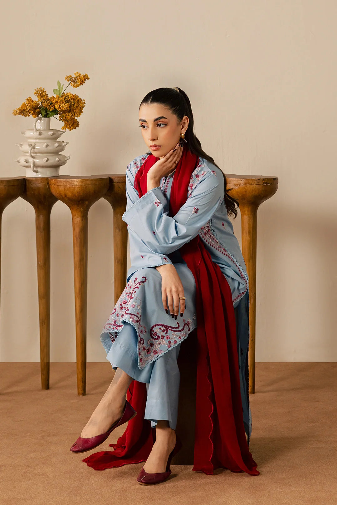 A graceful light blue and red three-piece ensemble crafted from soft cotton fabric, featuring a shirt adorned with an embroidered neckline, hem, and sleeves highlighted with intricate detailing. Paired with plain blue trousers for a balanced look and completed with a chiffon dupatta featuring elegant scalloped embroidery, this outfit is perfect for a sophisticated festive appearance.