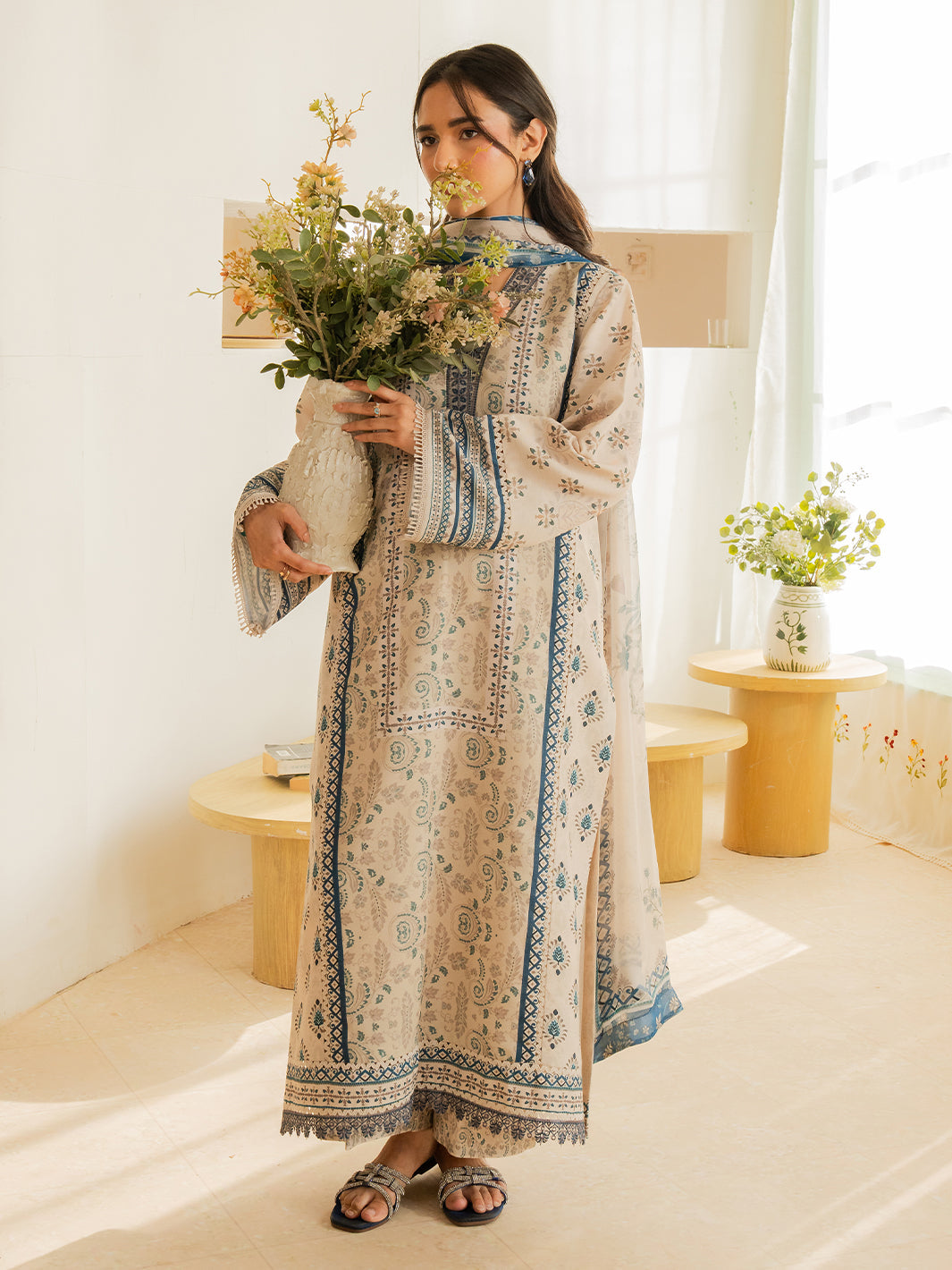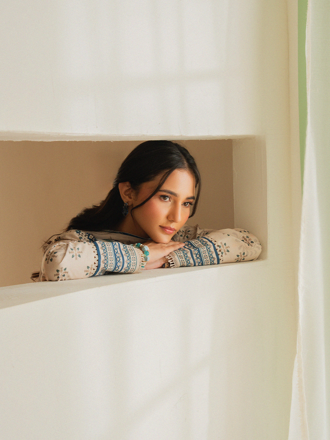The airy chiffon dupatta, patterned with subtle designs, adds a flowing elegance that completes the look. Whether it’s a warm cup of tea by the window or an afternoon gathering with friends, Zeya embodies quiet sophistication — a piece where serenity and style walk hand in hand.